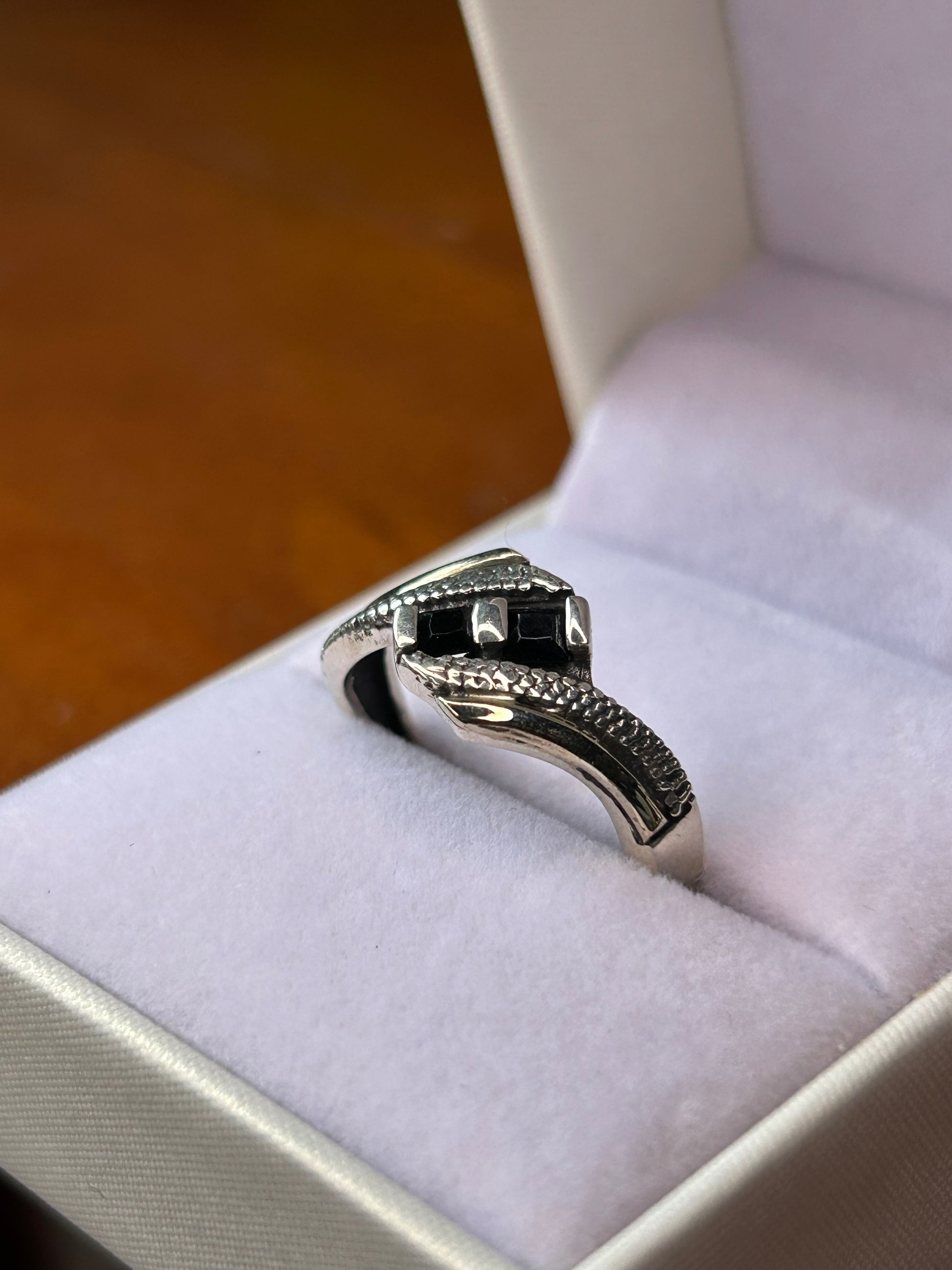 Anillo irregular de plata 925 con double de oro y circonias negras engarzadas. Medida 19mm de diámetro interno