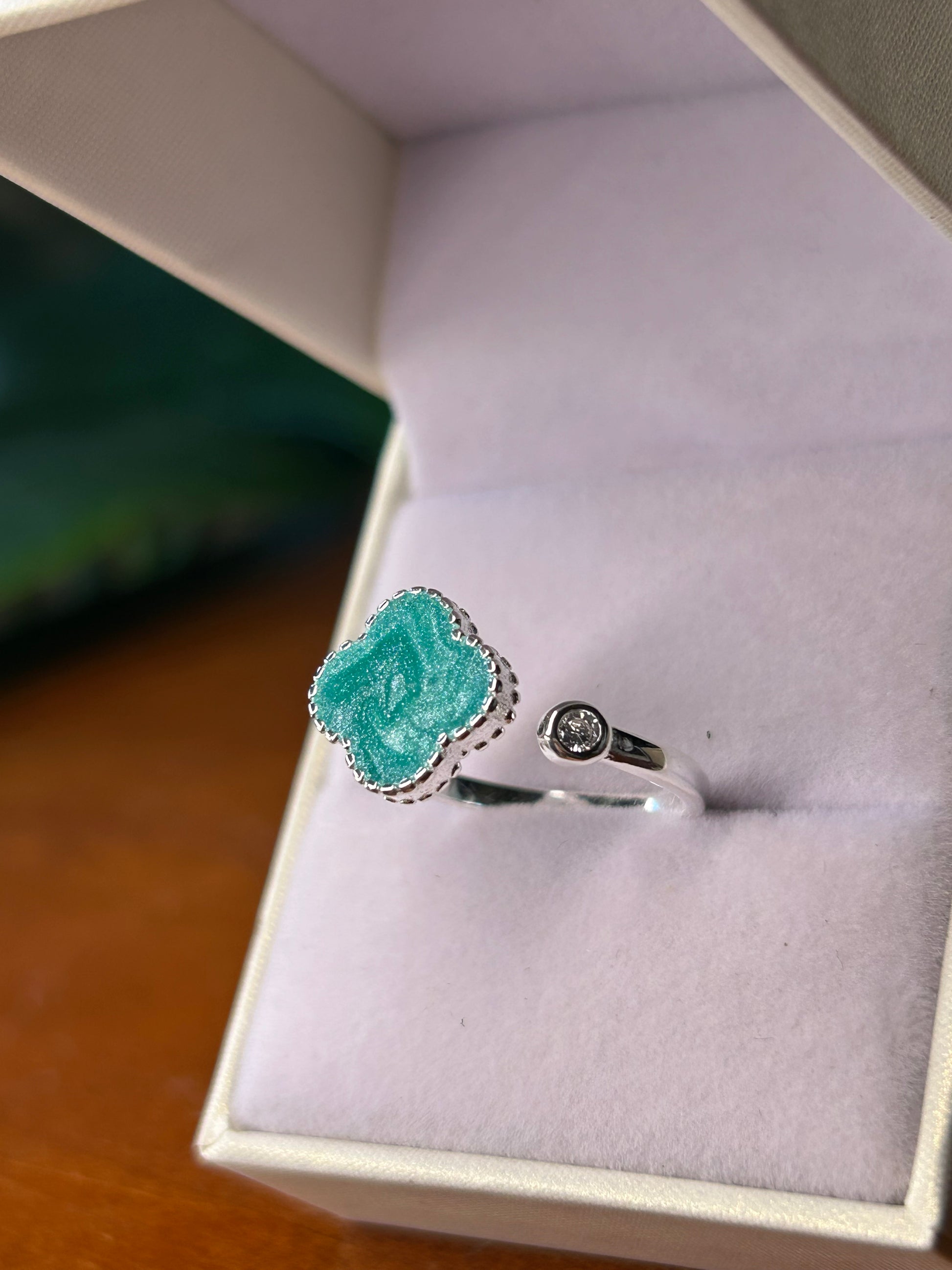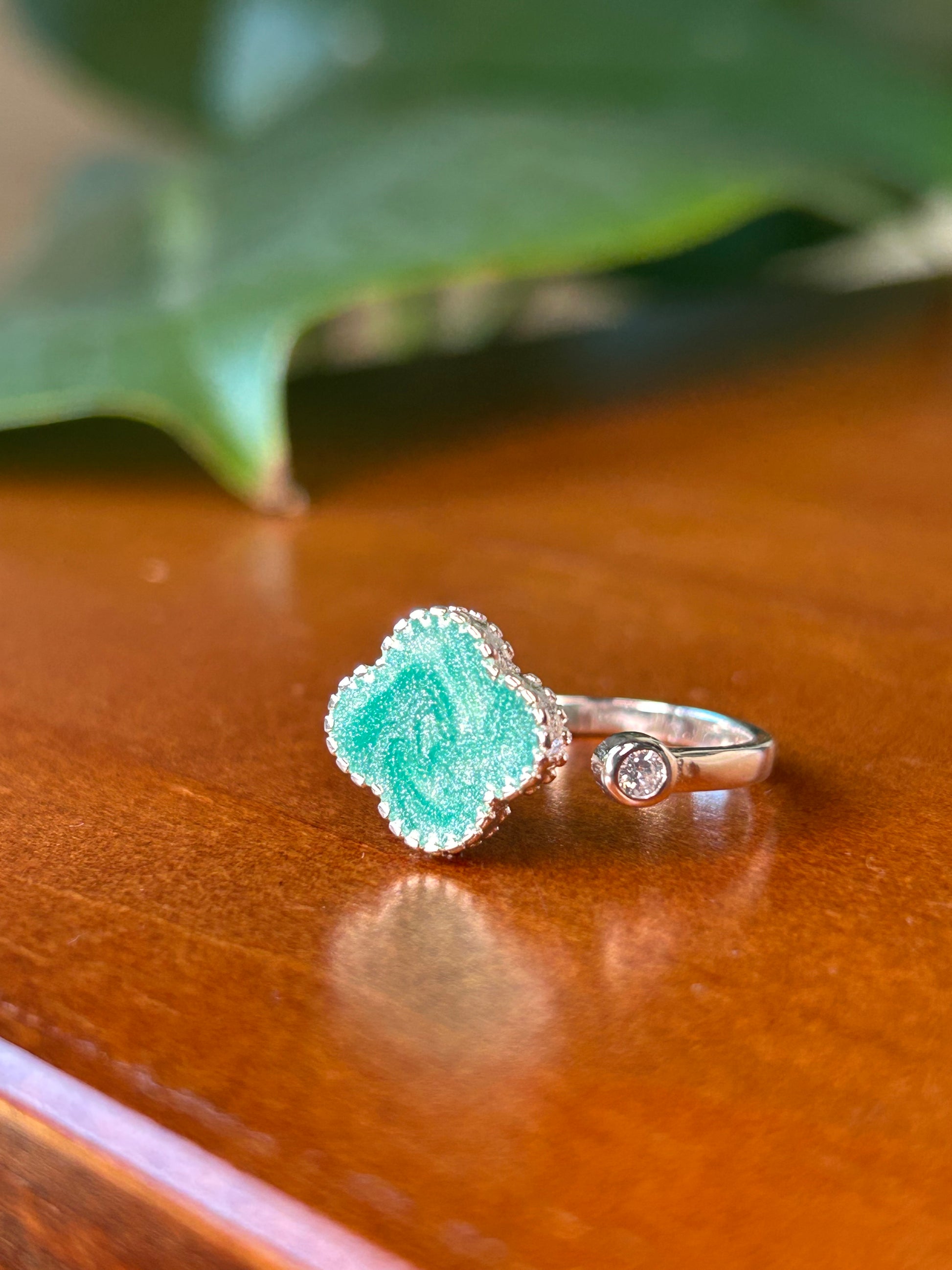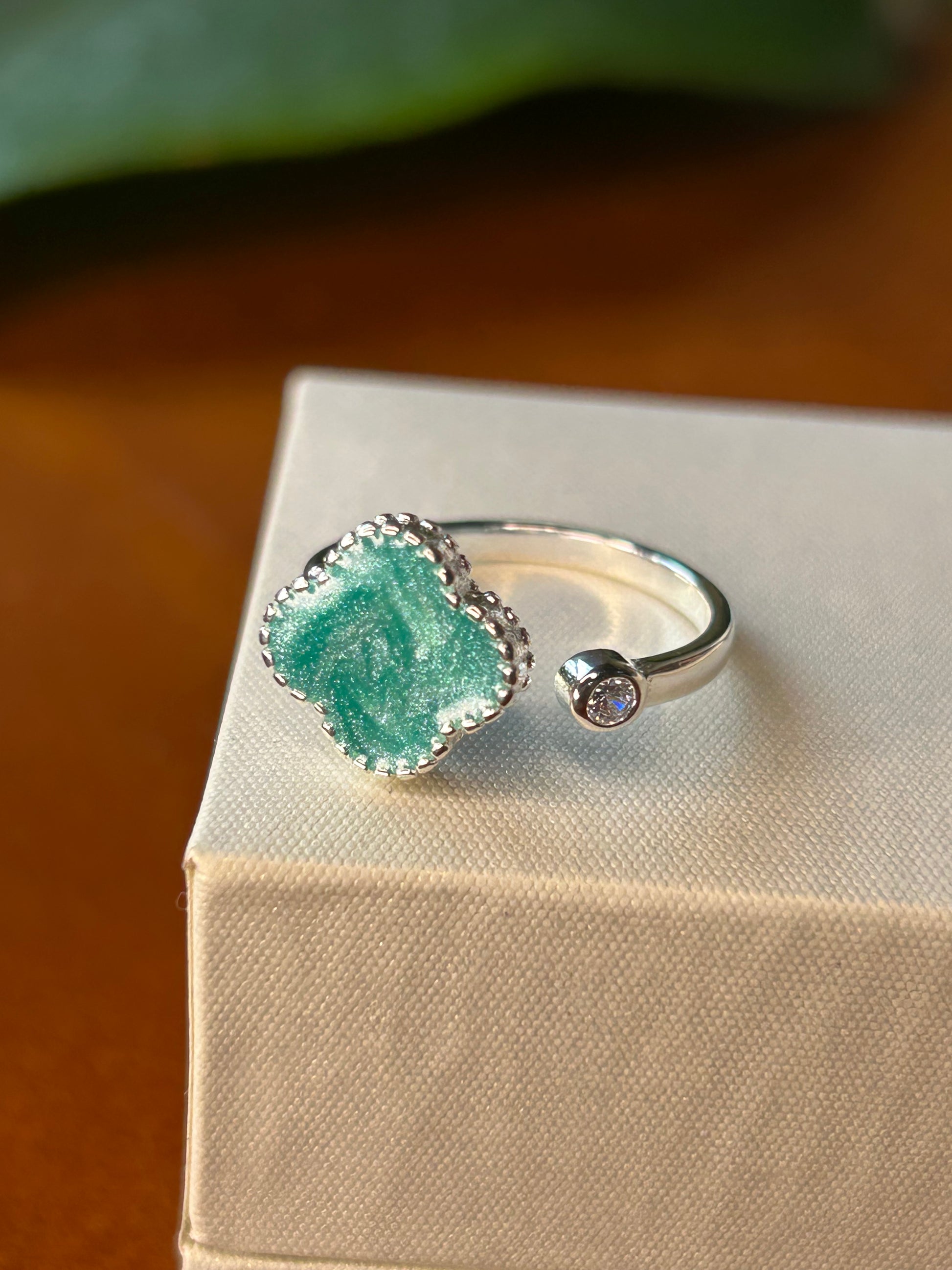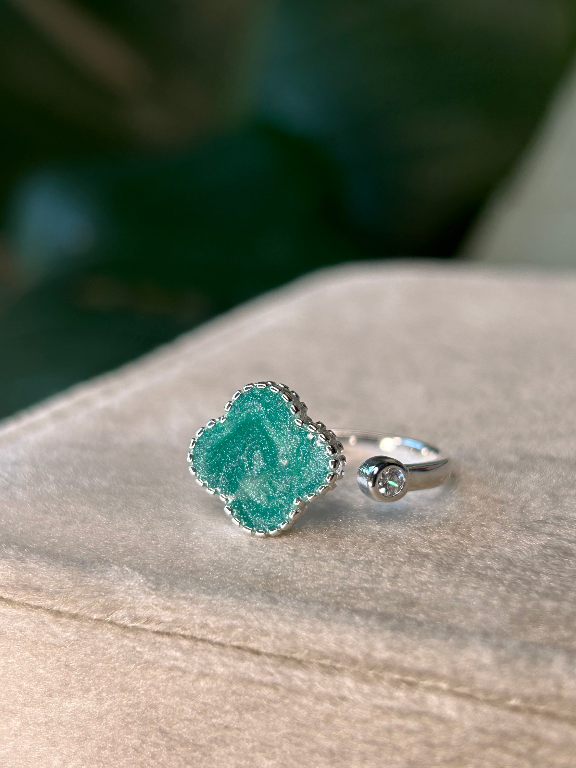 Anillo semi ajustable flor estilo Van Cleef con detalle en resina verde y punto de luz