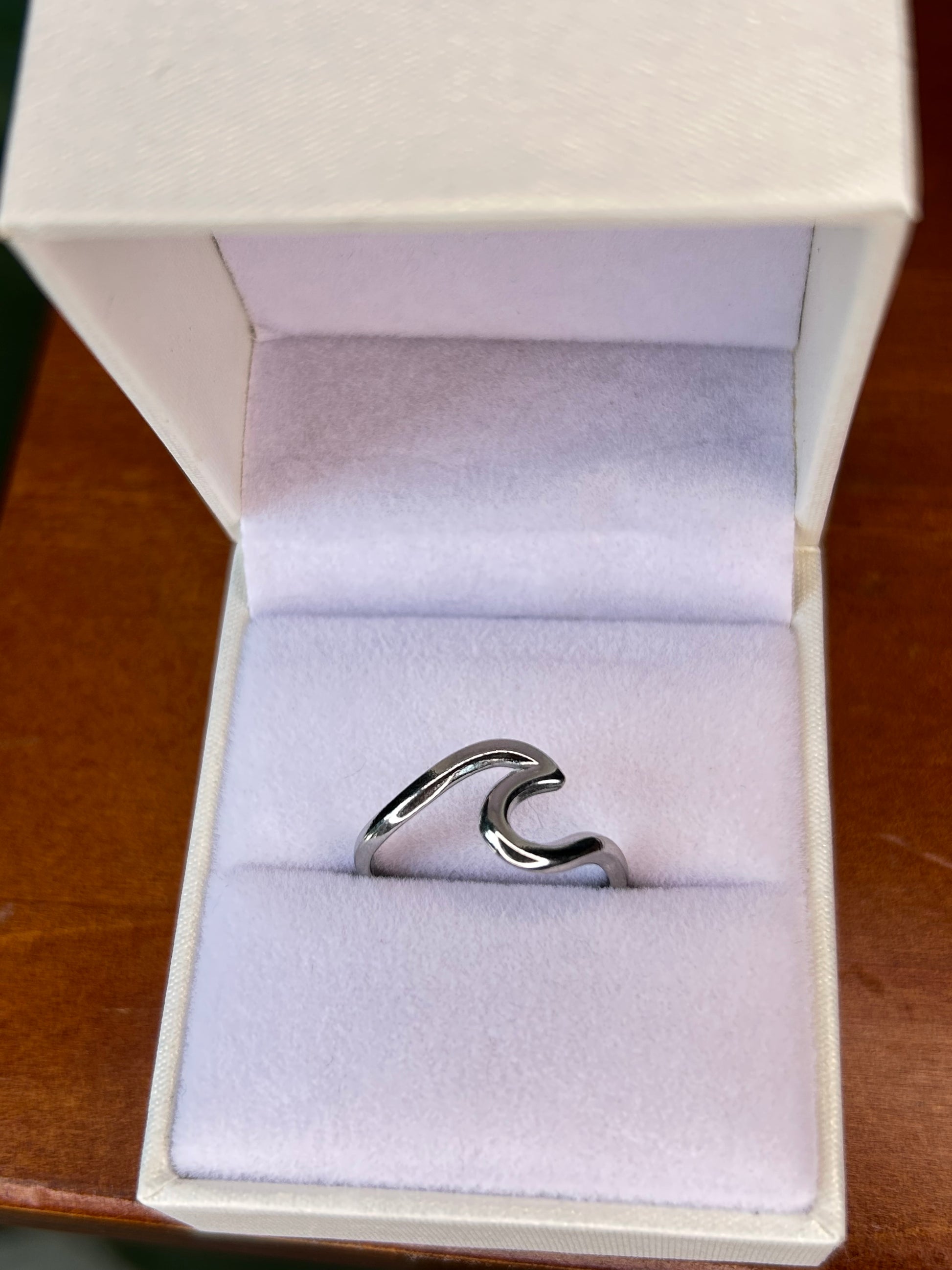 Anillo simple con diseño de ola . Semi ajustable con una medida que va desde los 15 hasta 17cm aproximadamente. Fabricado en acero hipo alergénico