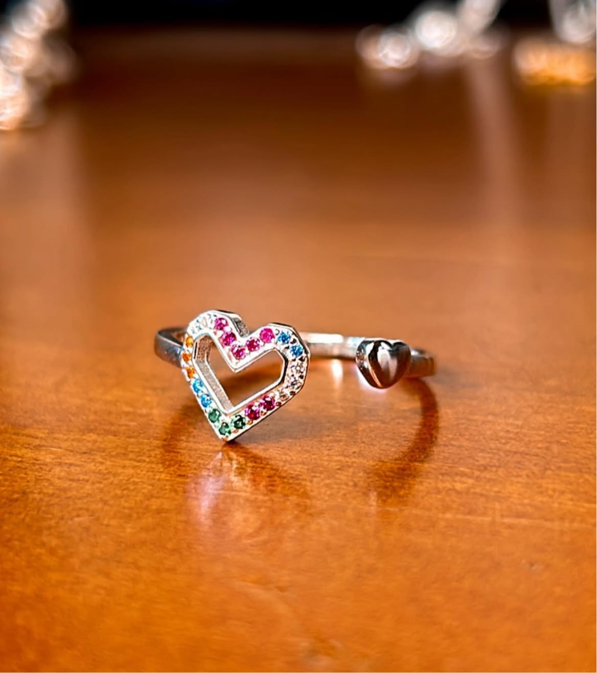 Anillo semi ajustable doble corazón, uno con detalle de circonias de colores y el otro en plata macizo pequeño.