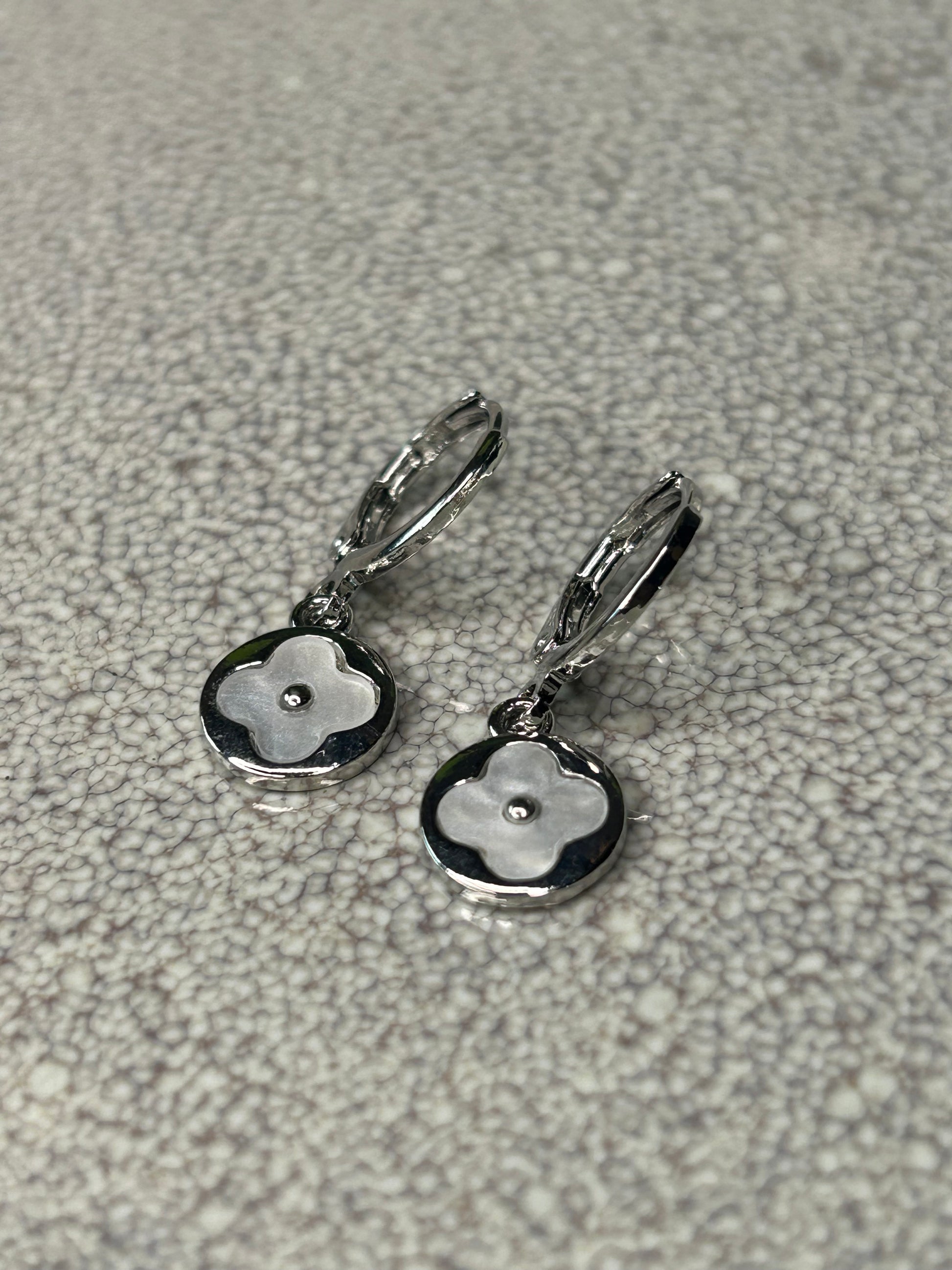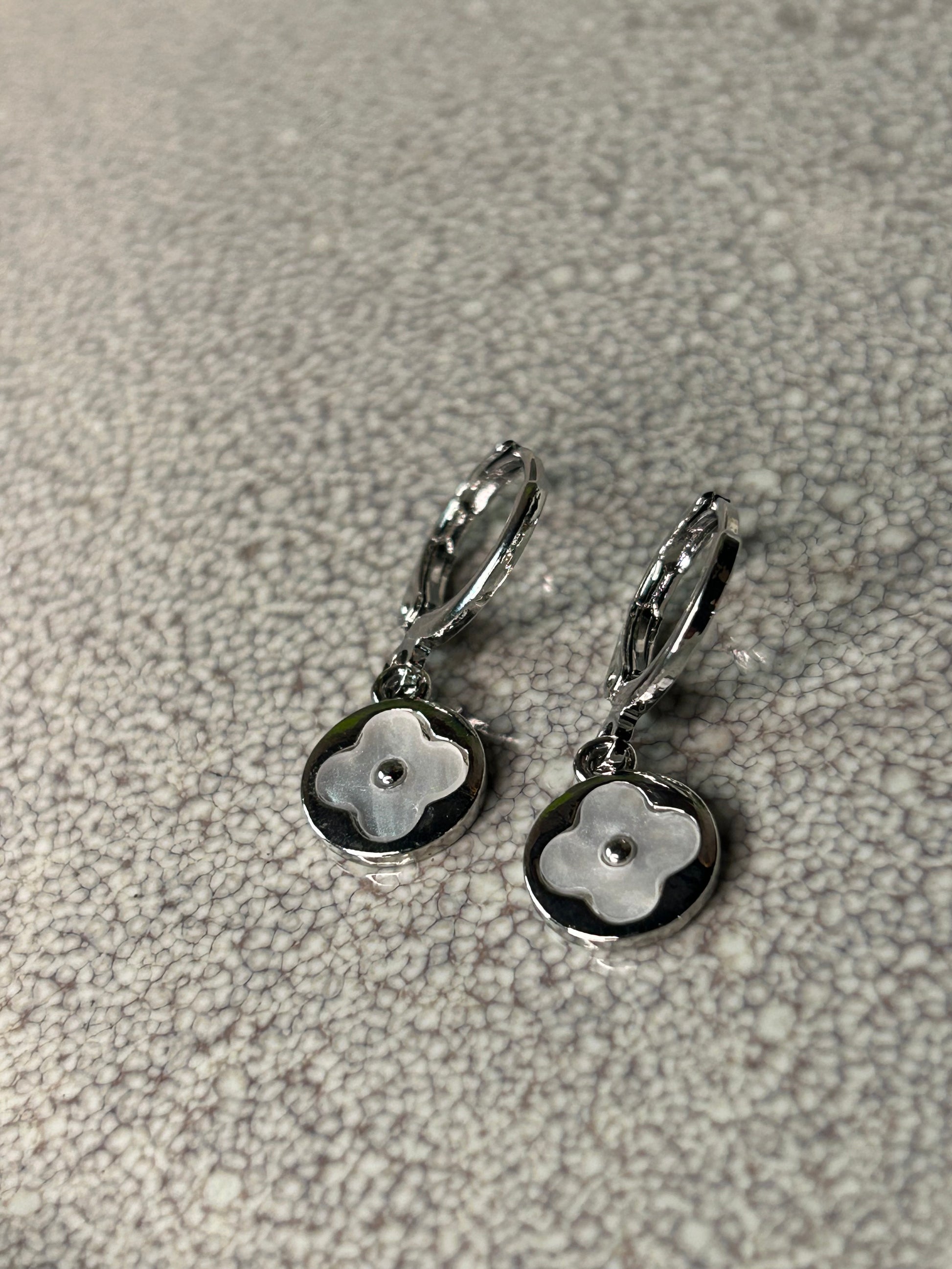 Aros bisura con flor plateada y nacarada. 10mm de diámetro . Acero inoxidable hipo alergénico
