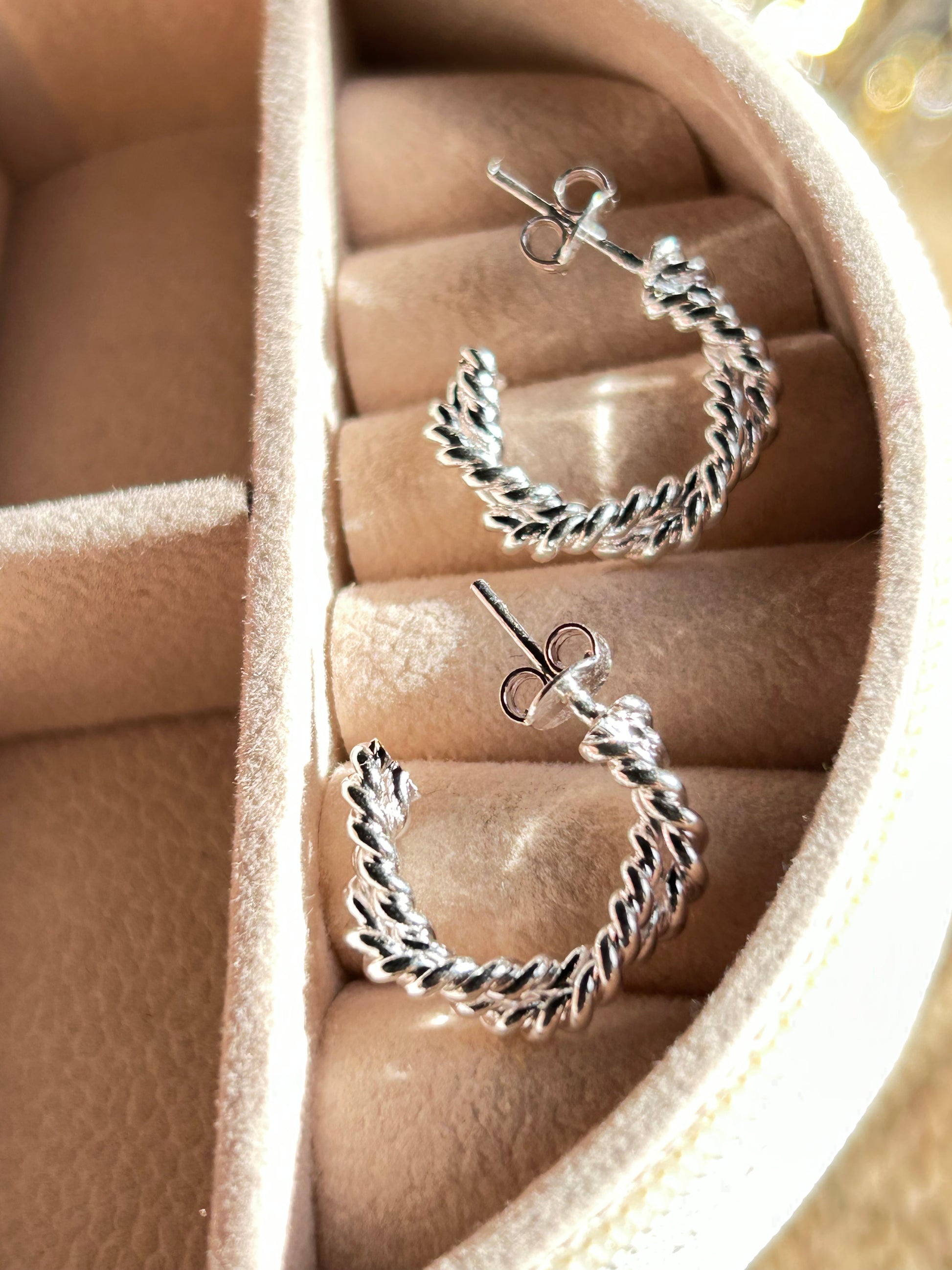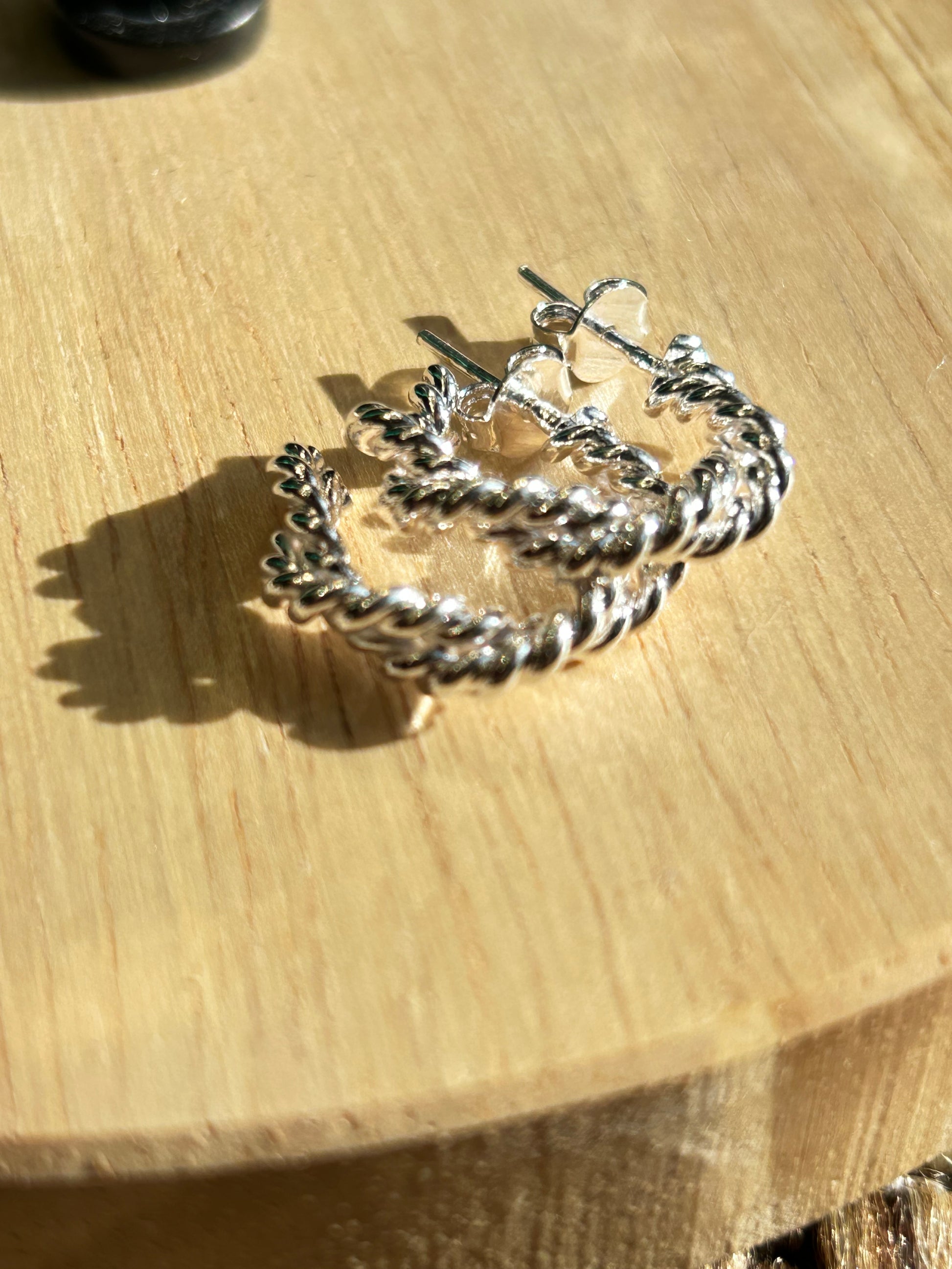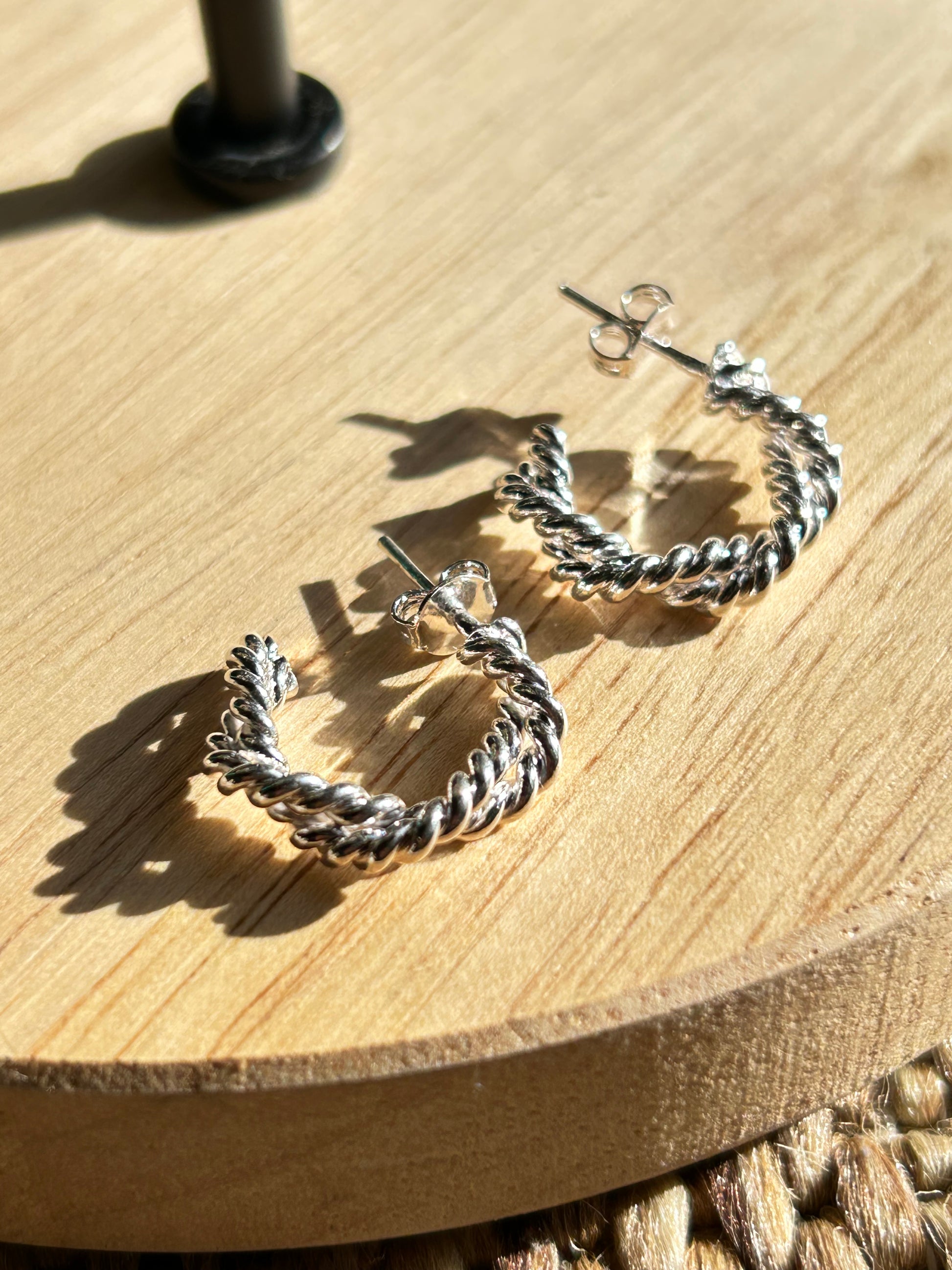 Aros torzados medianos bañados en plata 20MM aproximadamente. Cierre mariposa
