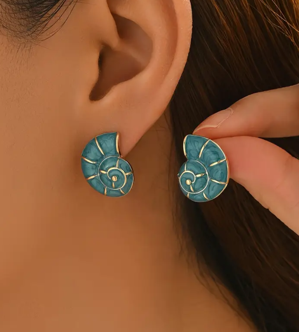 Hermosas caravanas con diseño de caracoles en color azul nacaranado. Tamaño mediano, medidas aproximadas 2x1,6cm.