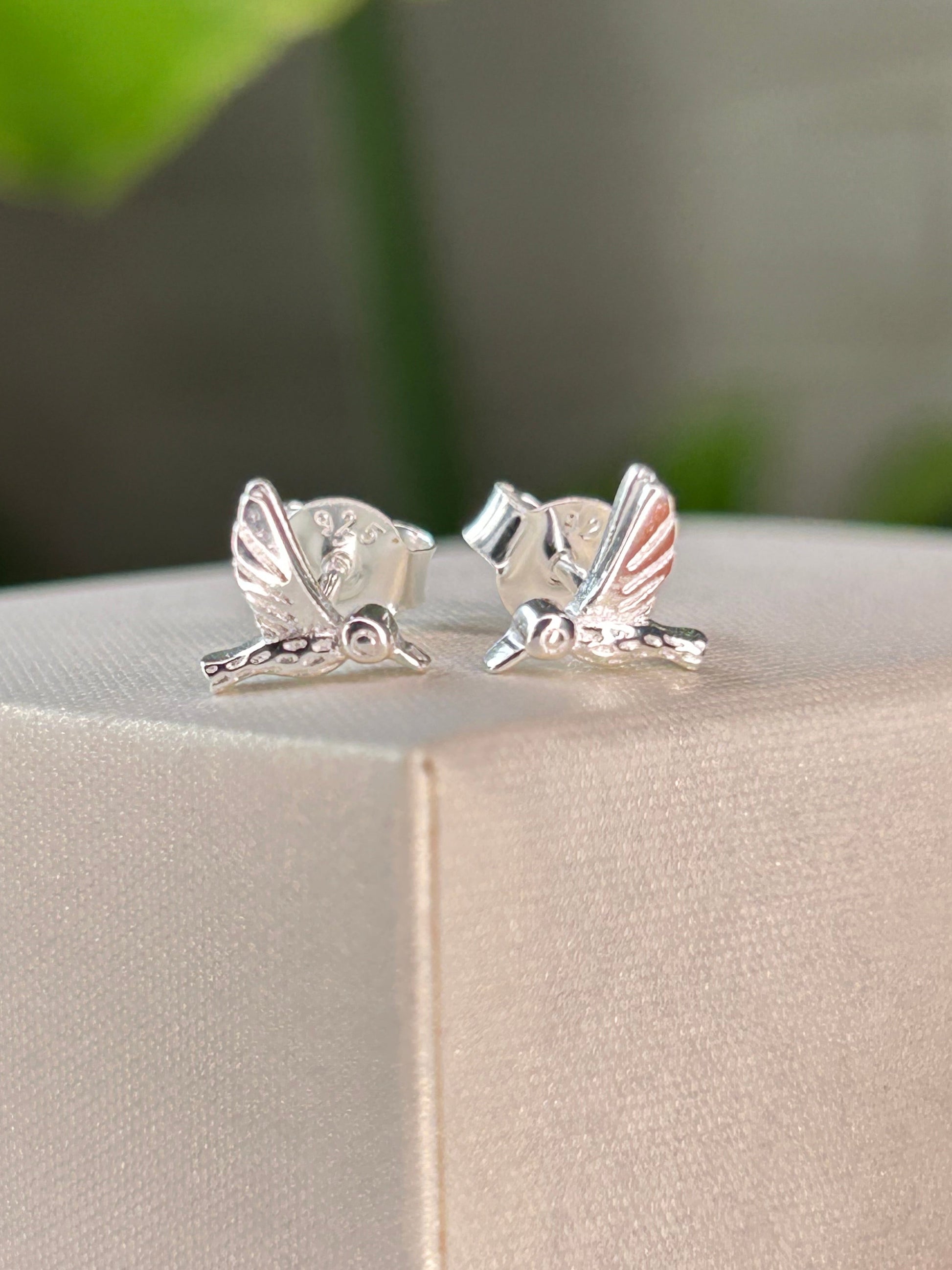 Delucadas caravanas con diseño de colibrí con ala dobles y textura en el cuerpo.