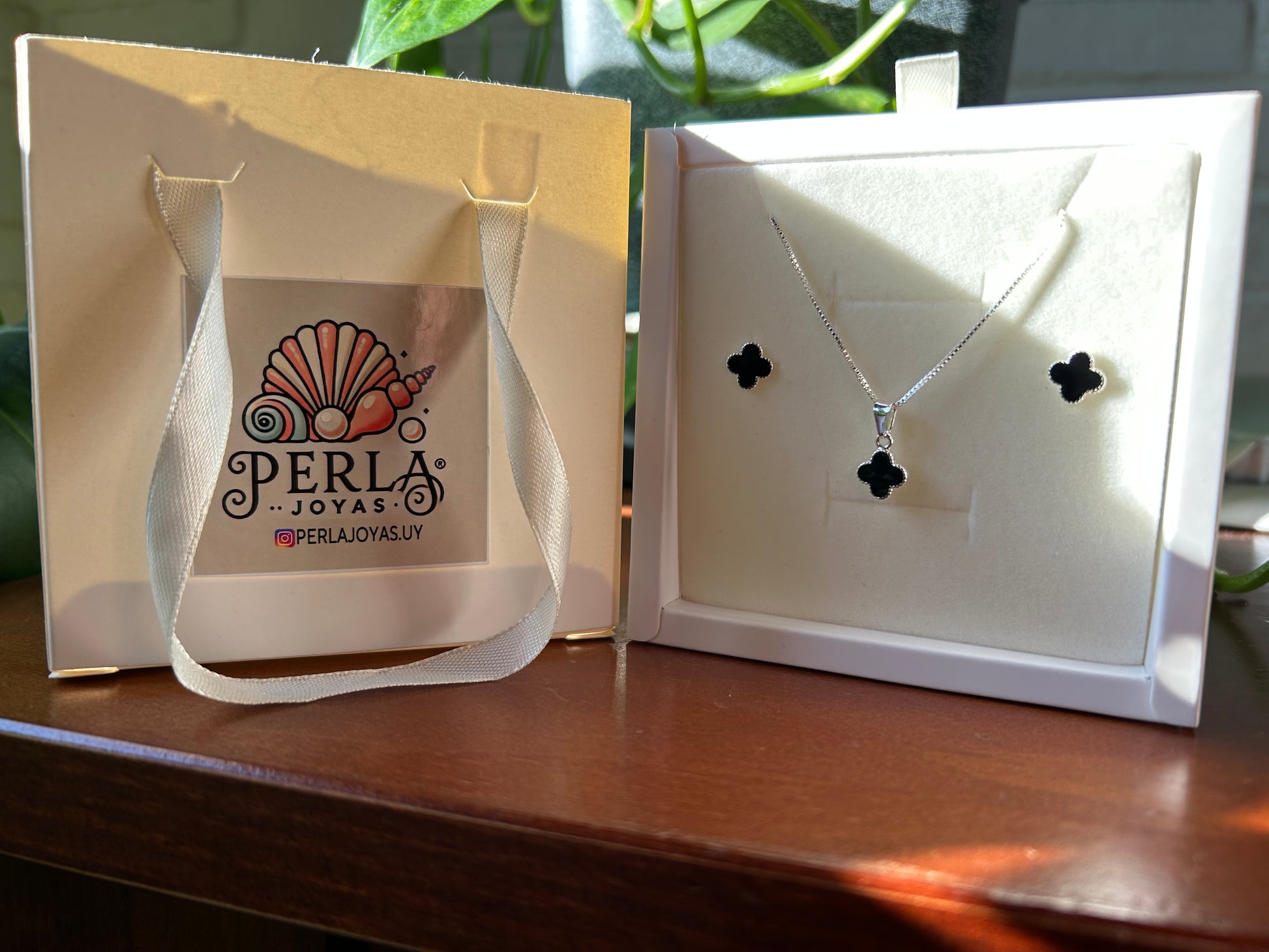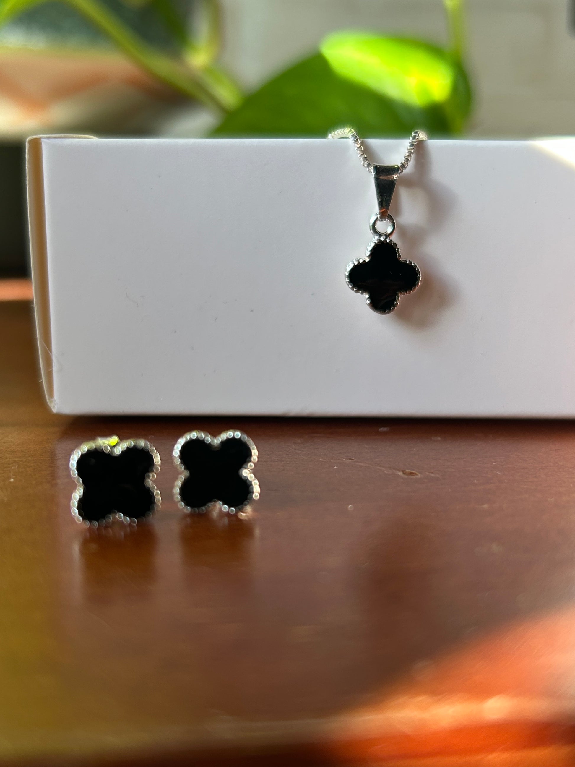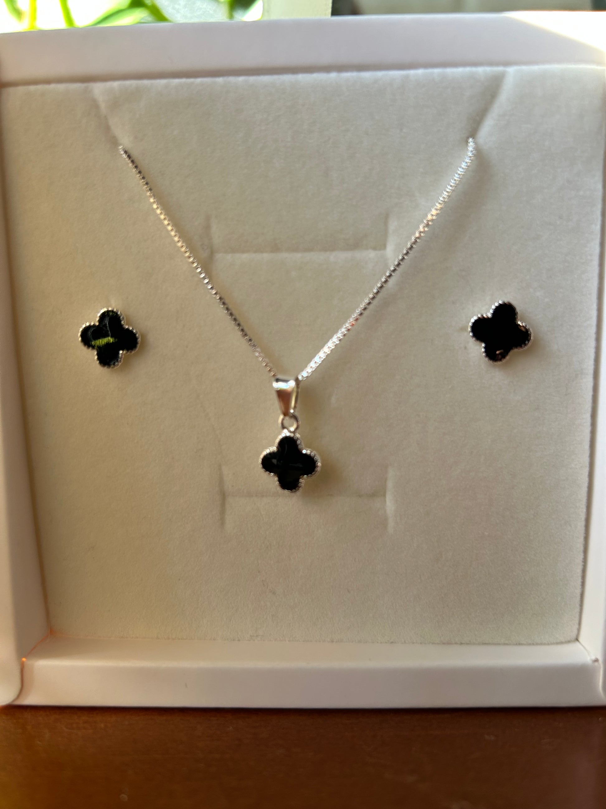 Conjunto dije más cadena de 45 mm. Caravanas a juego con el dije, resina negra y cierre mariposa. Bañado en plata.