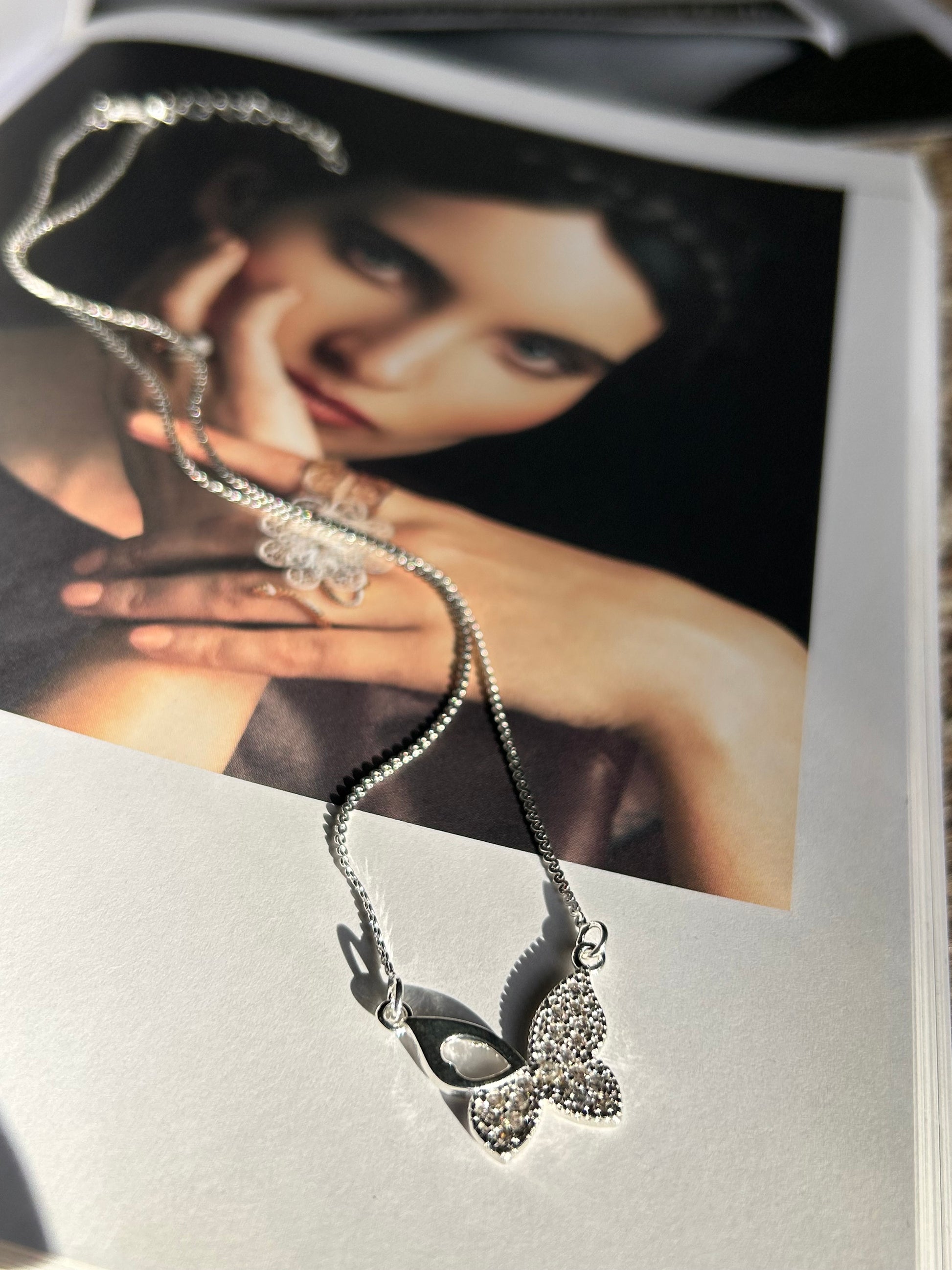 Conjunto dije mariposa con la midad brillosa y ala calada.