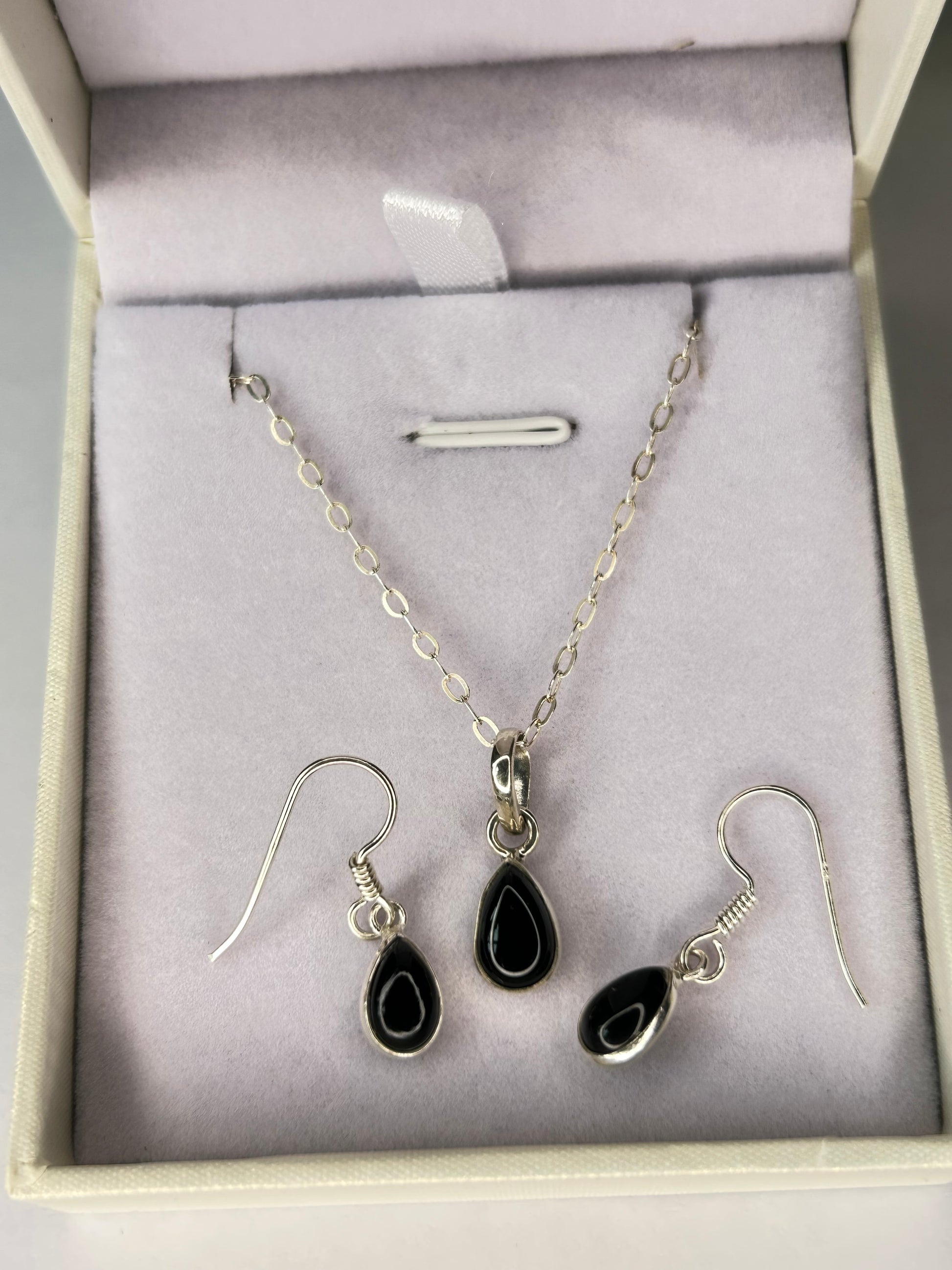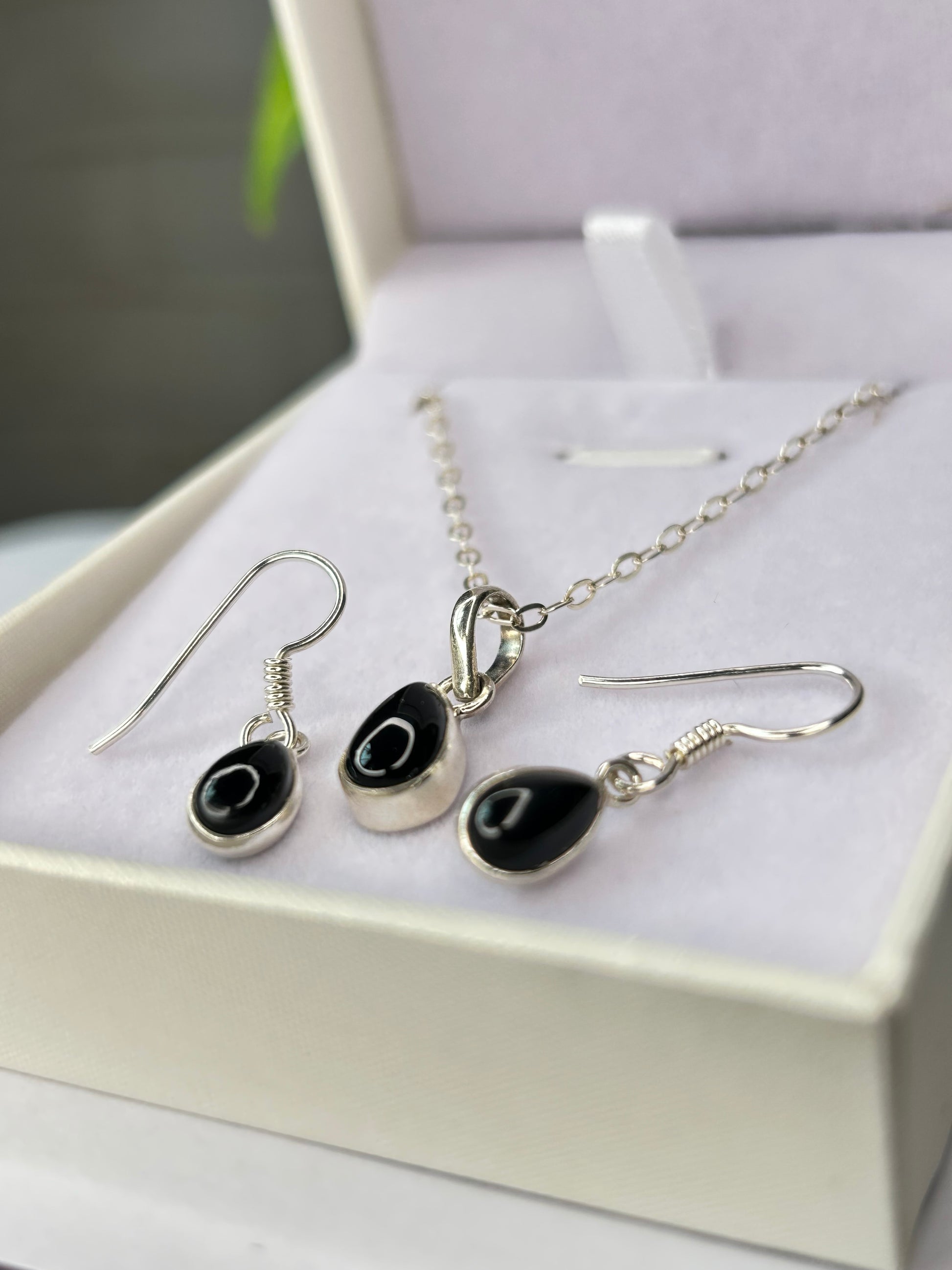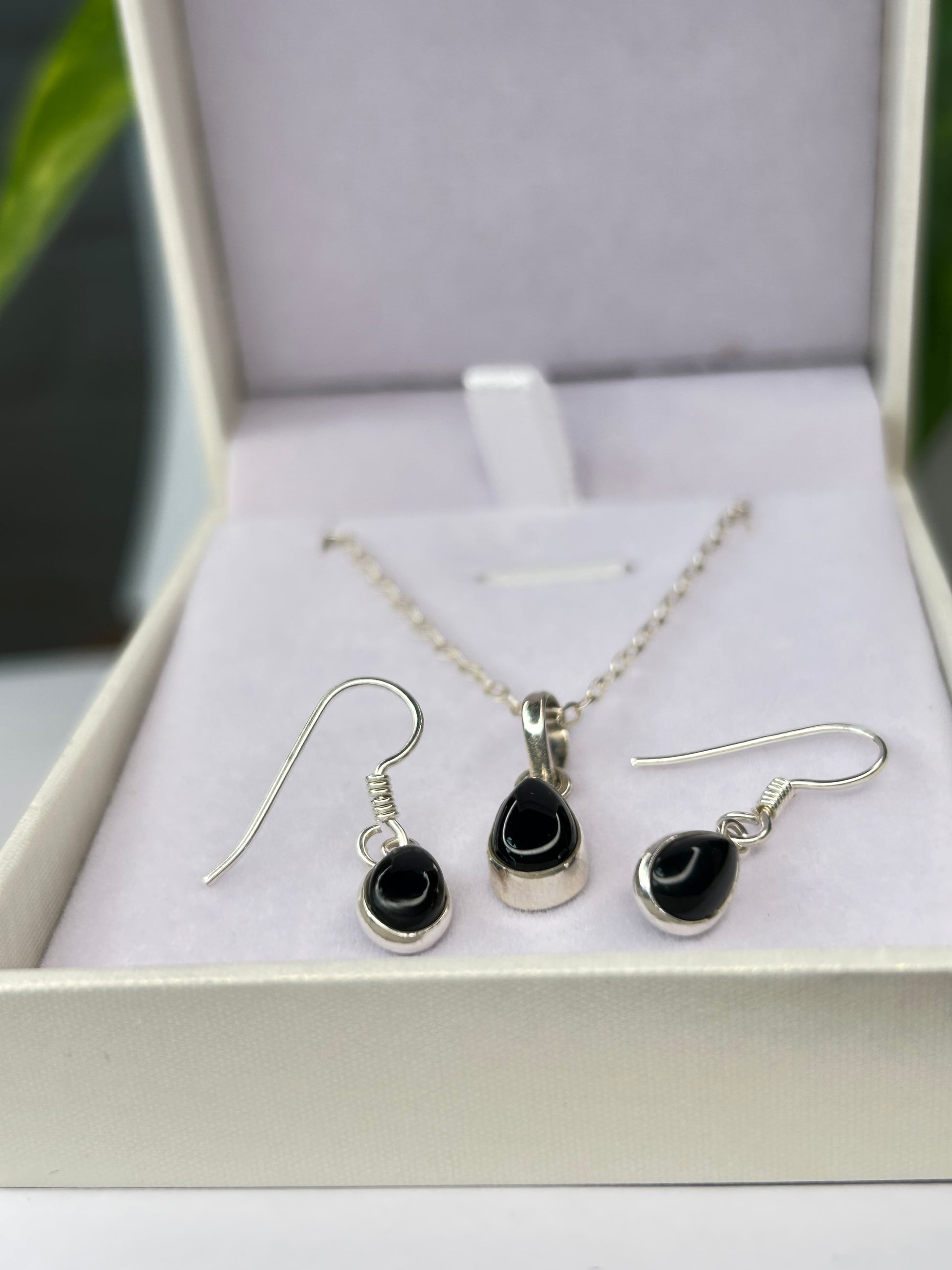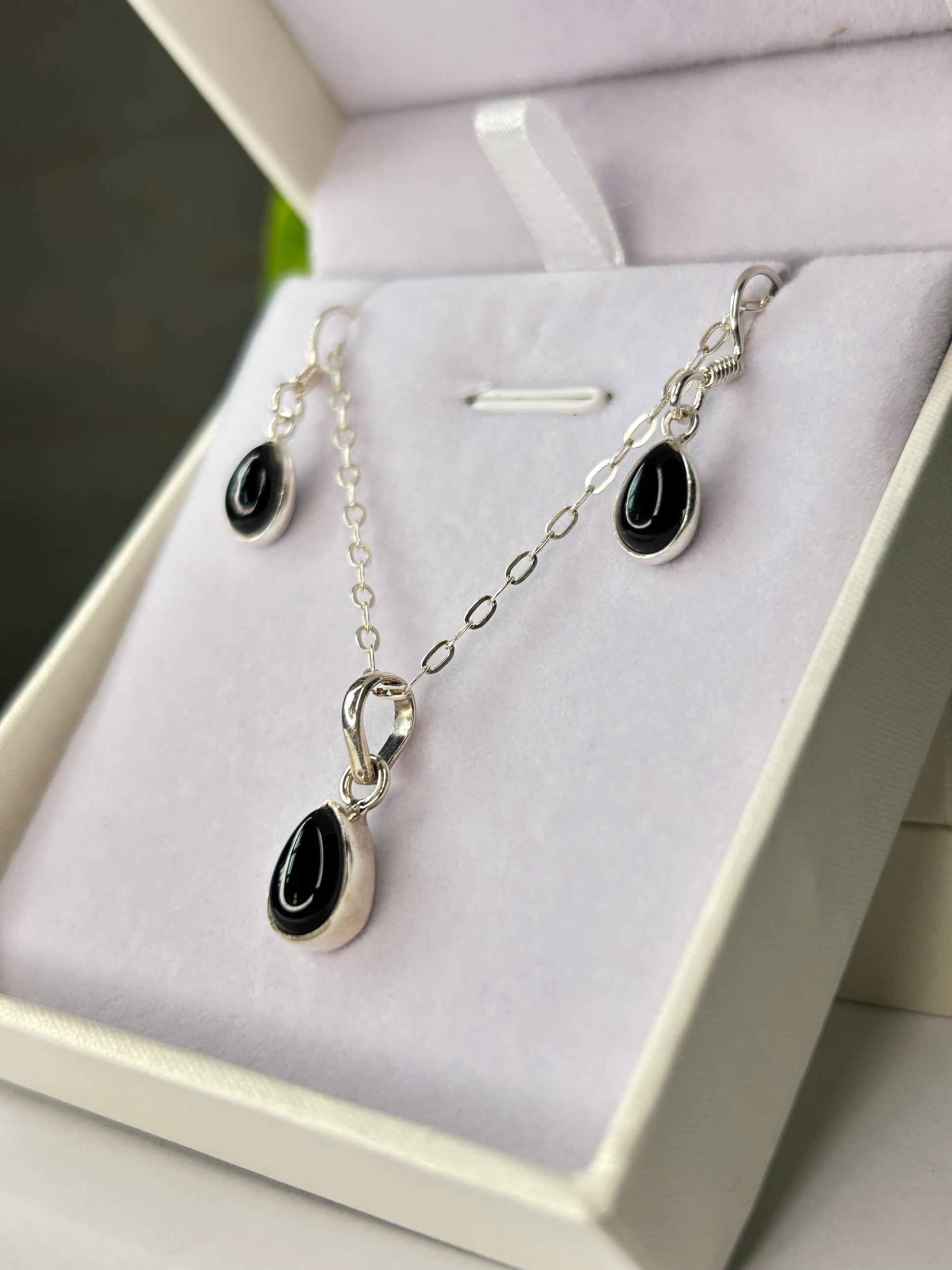 Conjunto cadena con dije + aros con cierre gancho y piedras ónix.