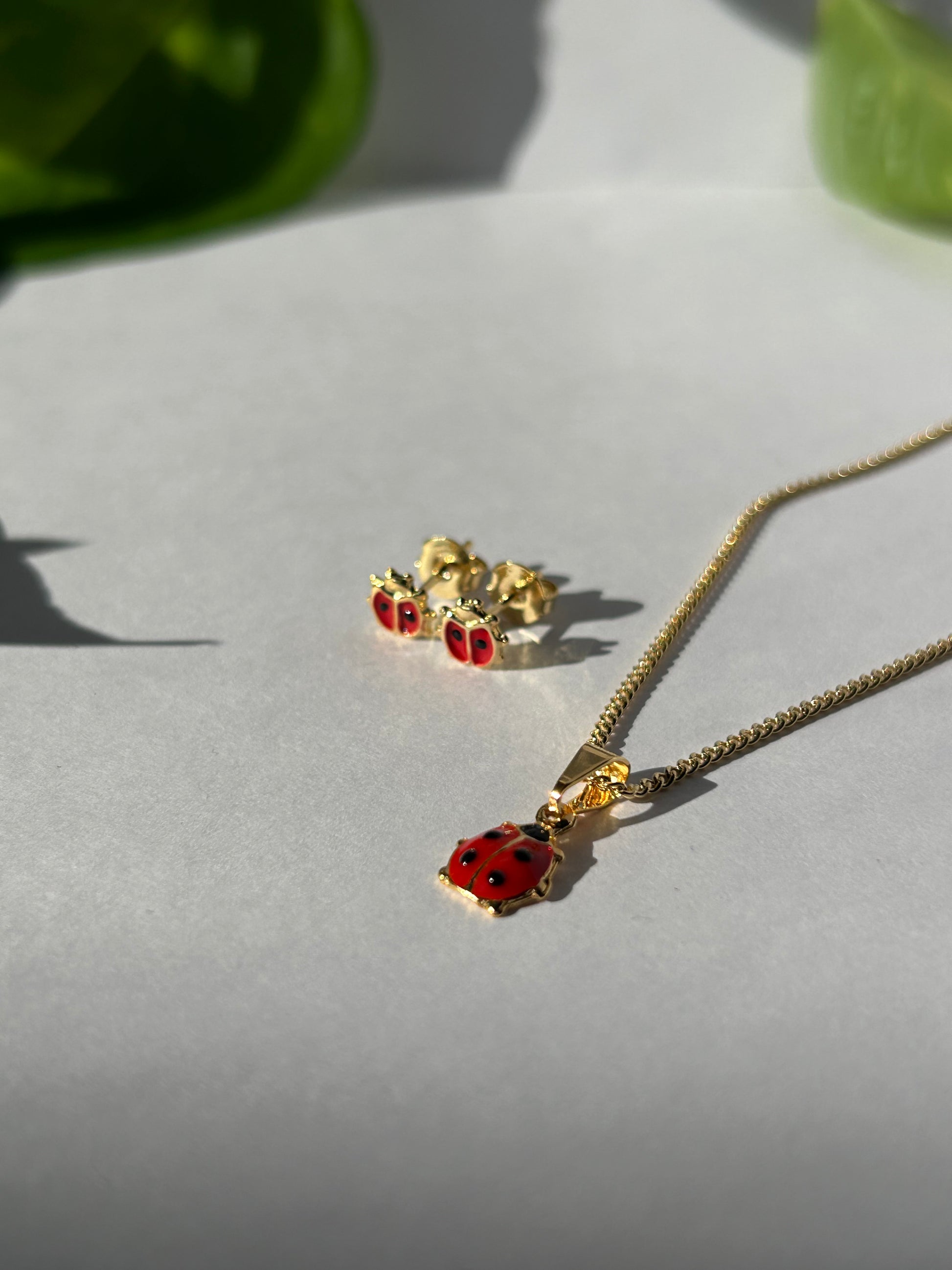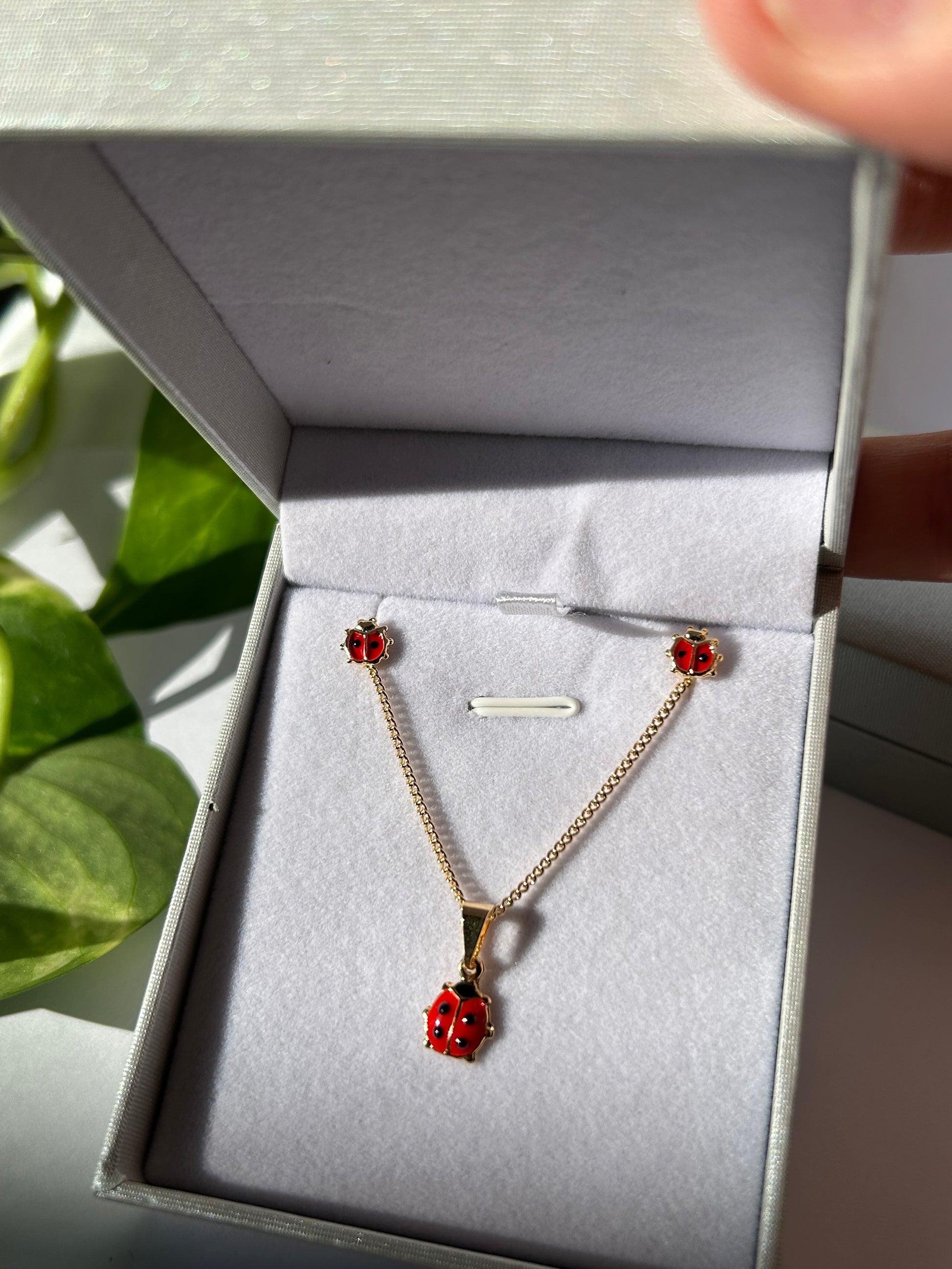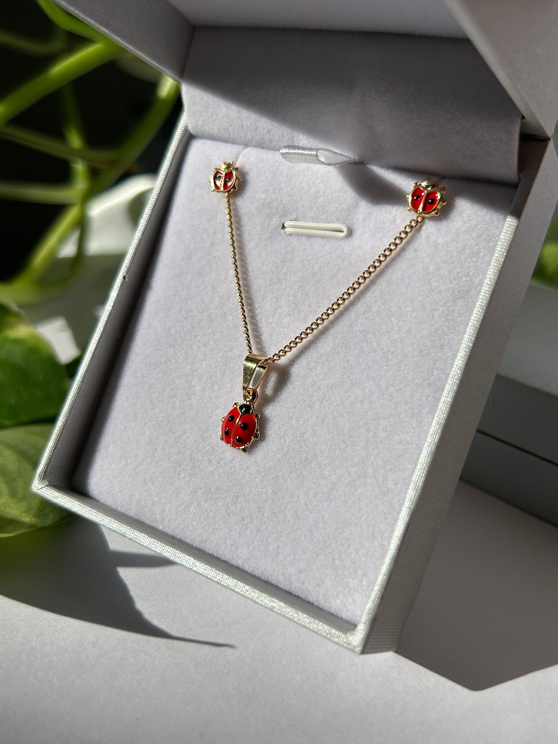 Conjunto cadena 45cm bañada en oro 18k más dije esmaltado bañado en oro. Par de caravanas bañadas en oro con cierre mariposa