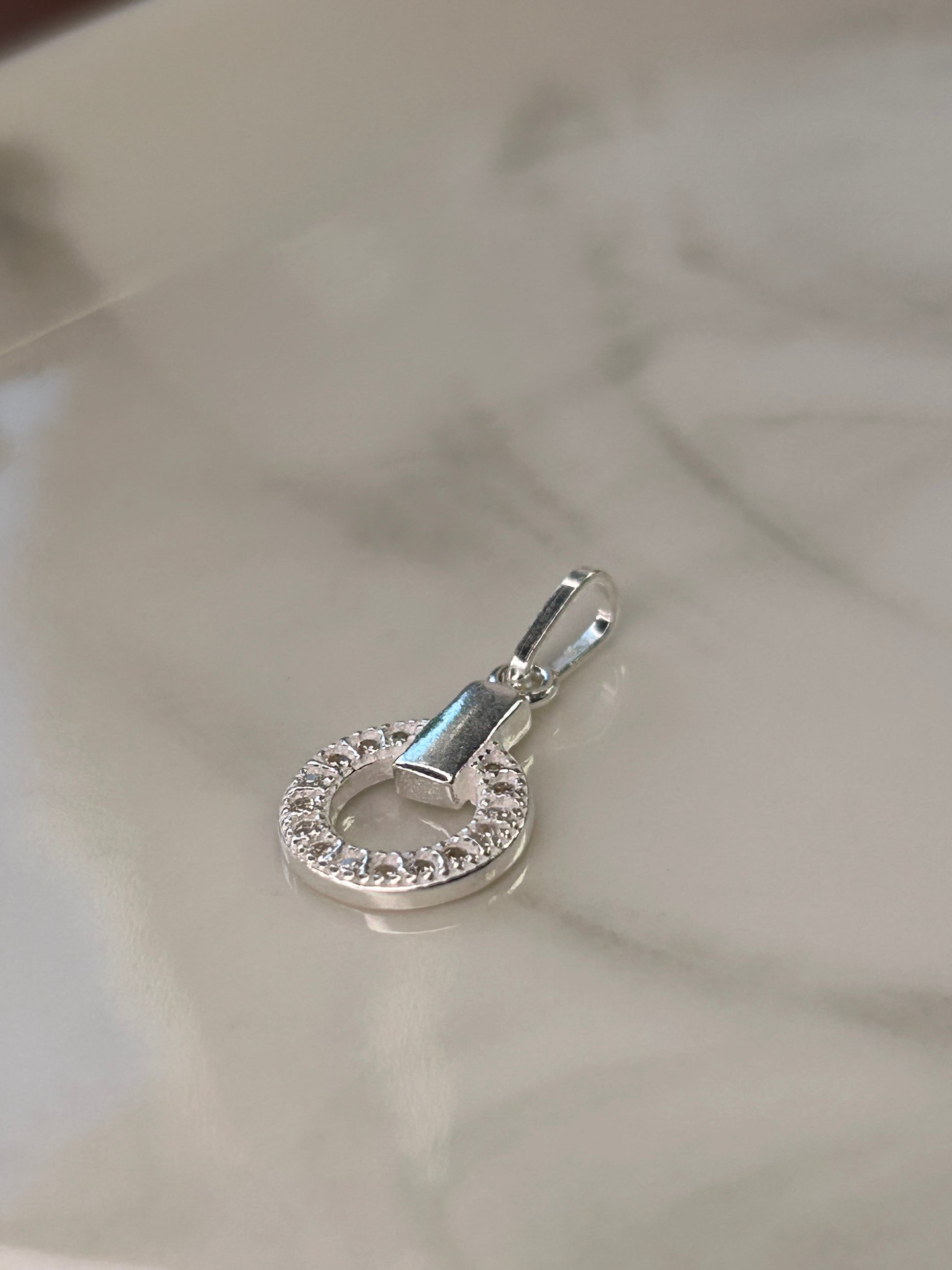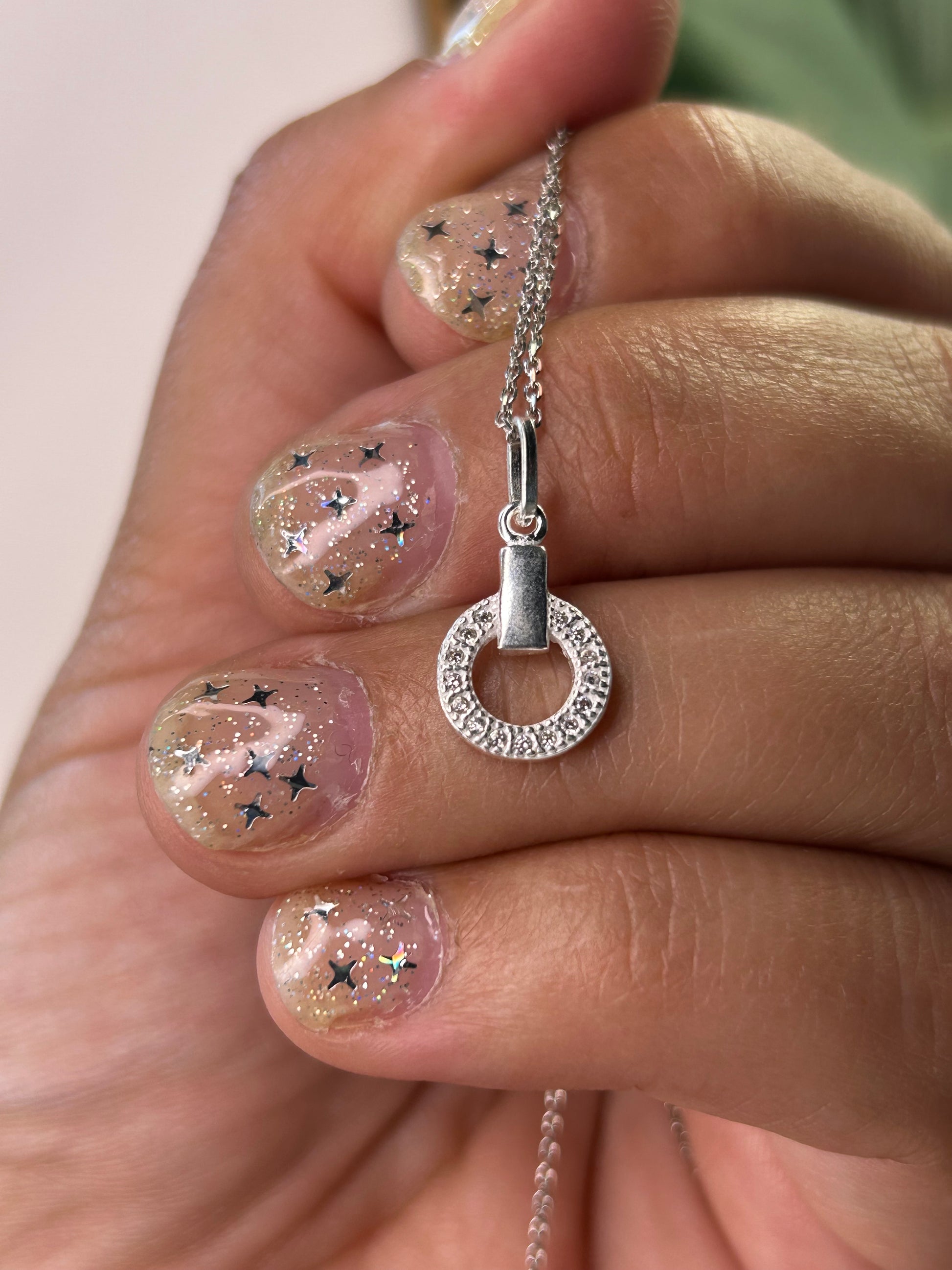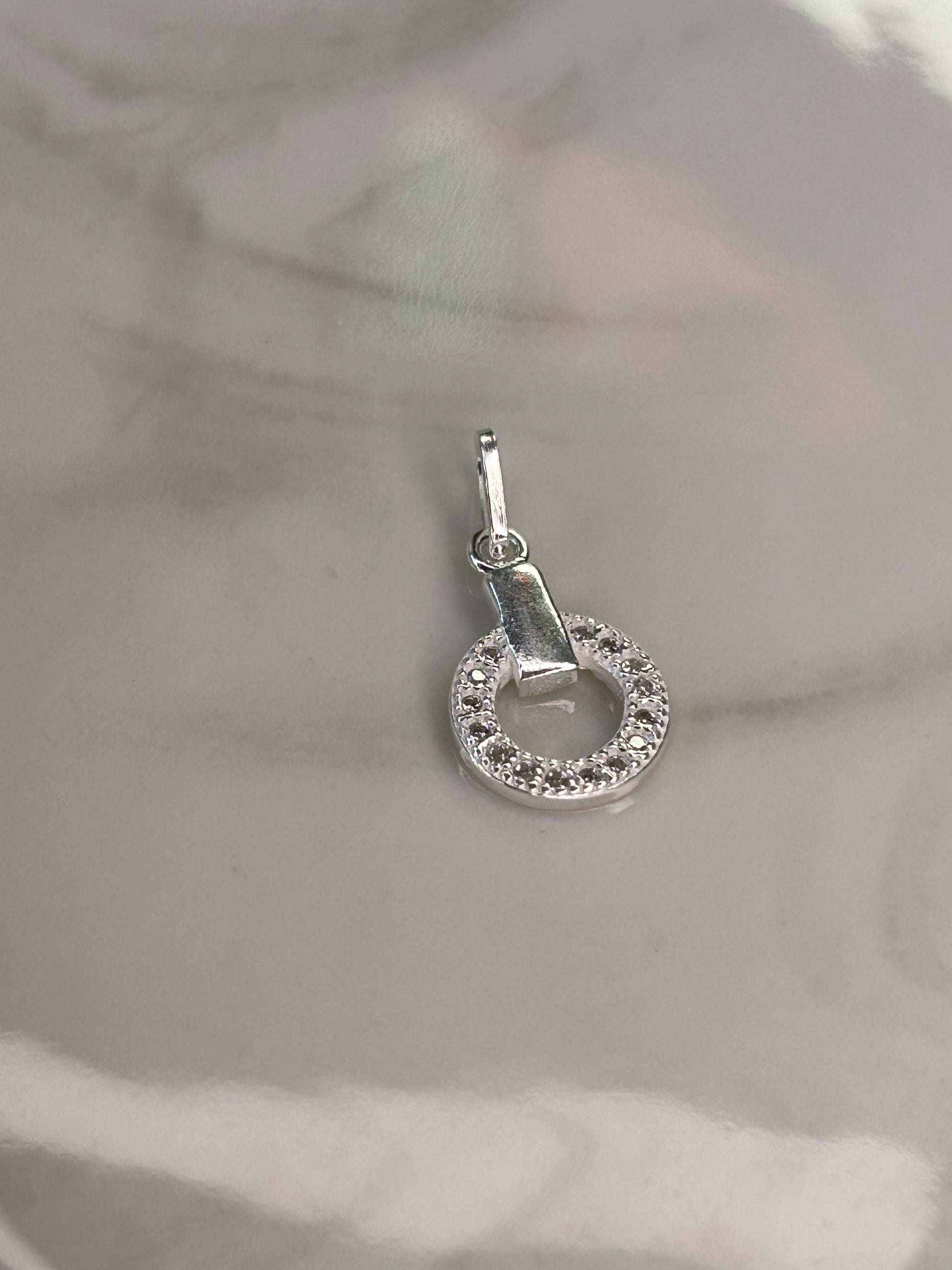 Dije círculo con circonias 10MM . La medida no incluye contra argolla .