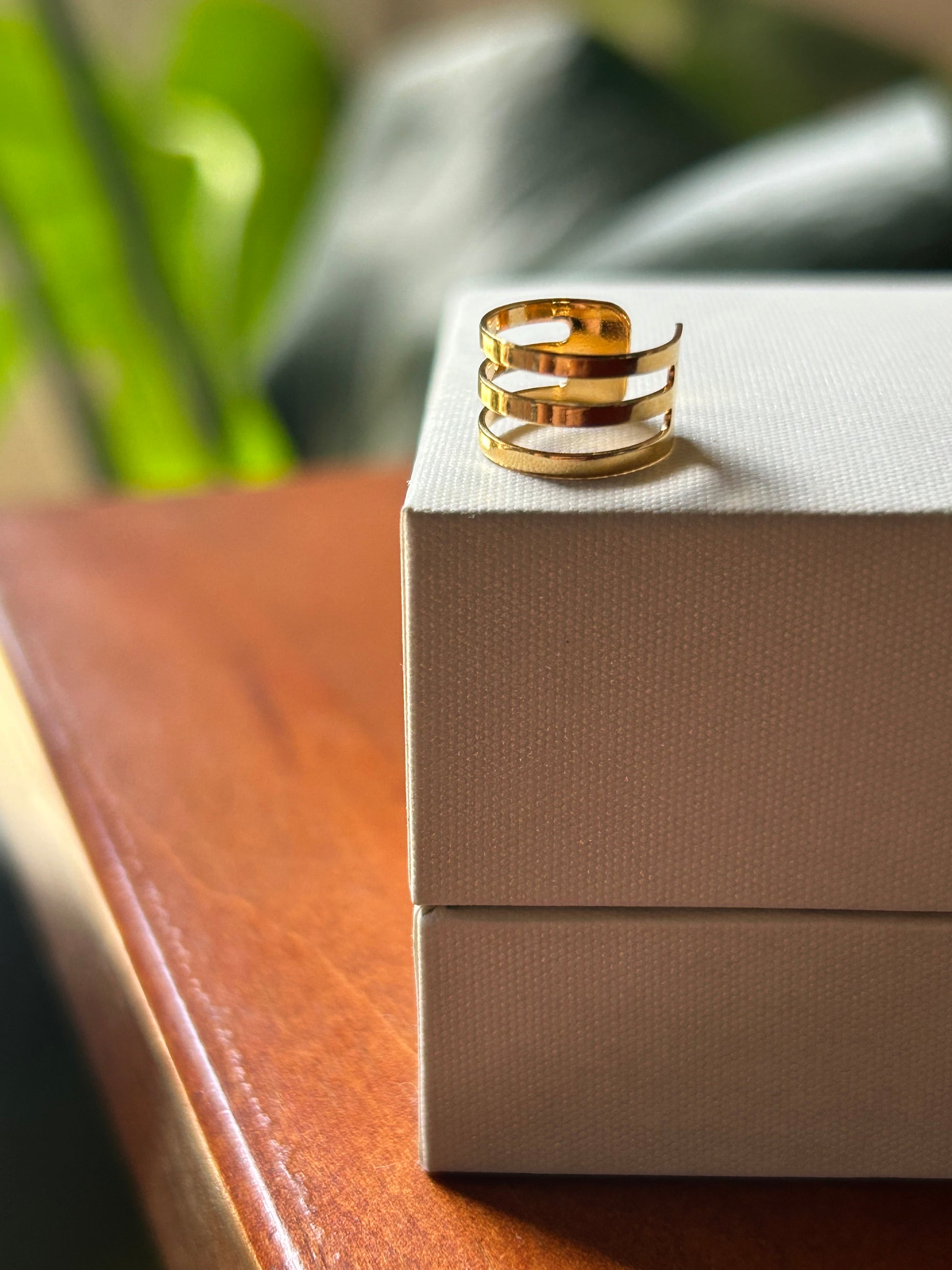 Ear cuff triple línea unida. Aleación metálica con alto baño de oro 18k de 5 milésimos para alta duración.
