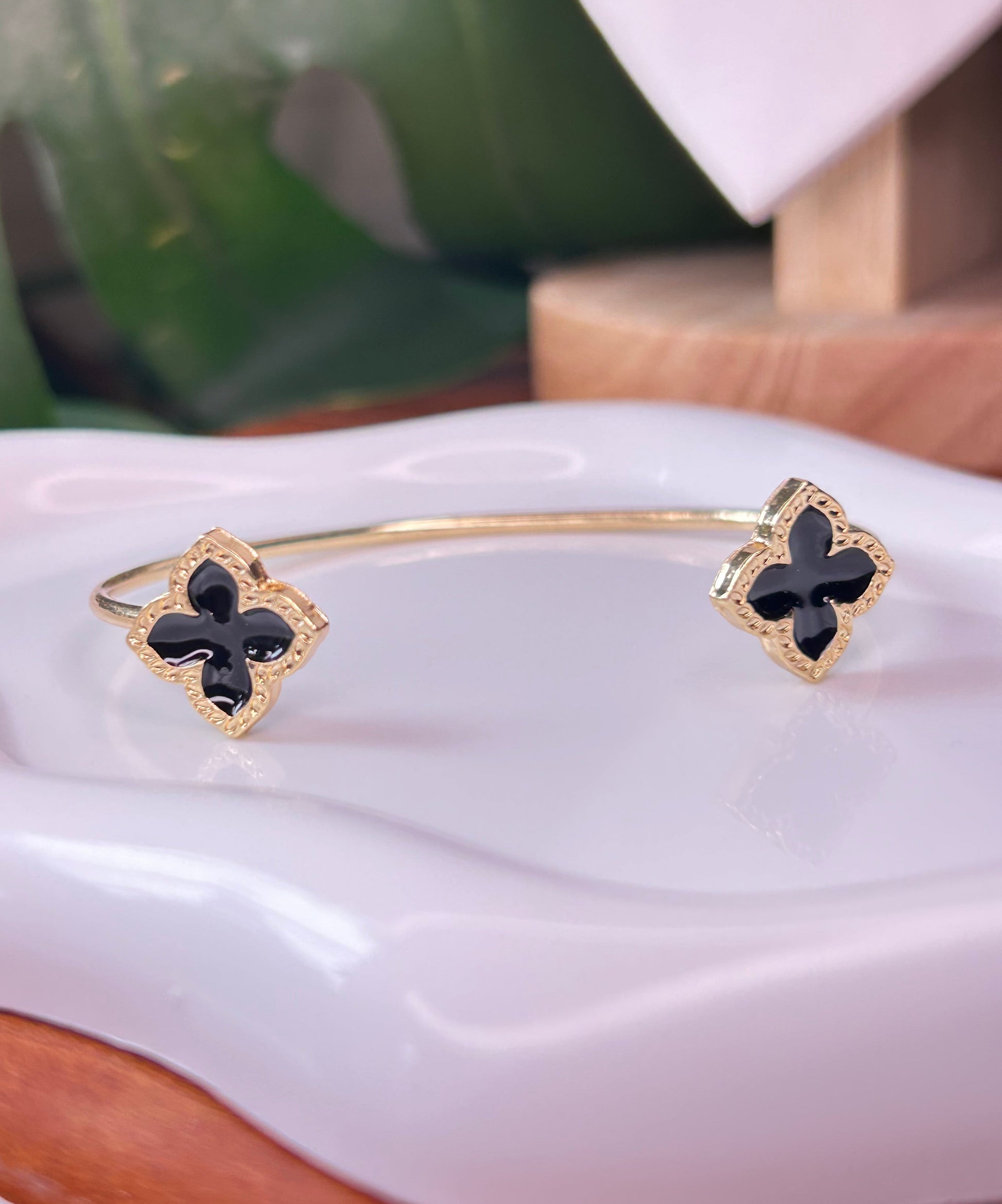 Pulsera estilo esclava abierta y diseño de flor negra.