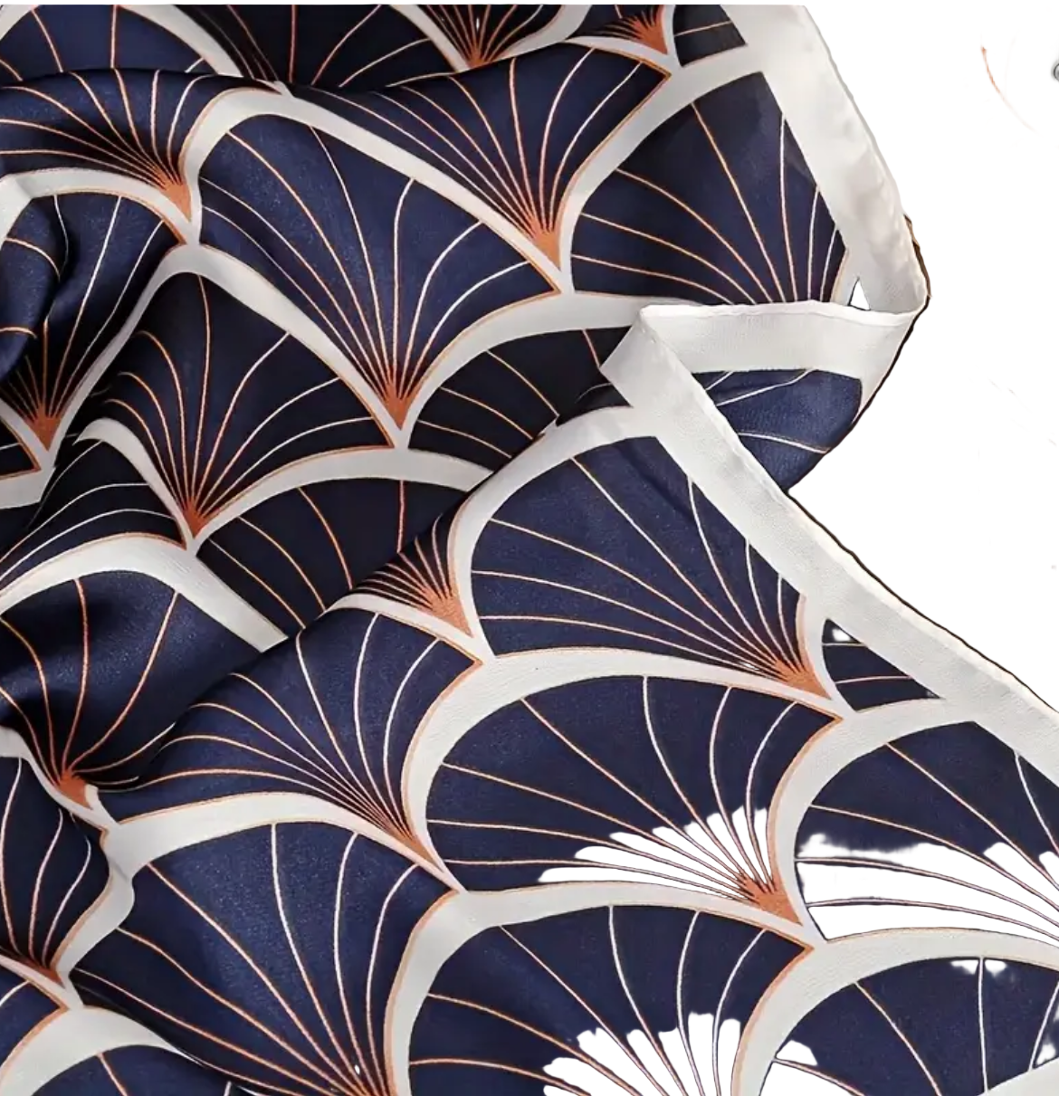 Elegante pañuelo de tela satinada en colores azules y borde color crema. Cuadrado 70cm.
