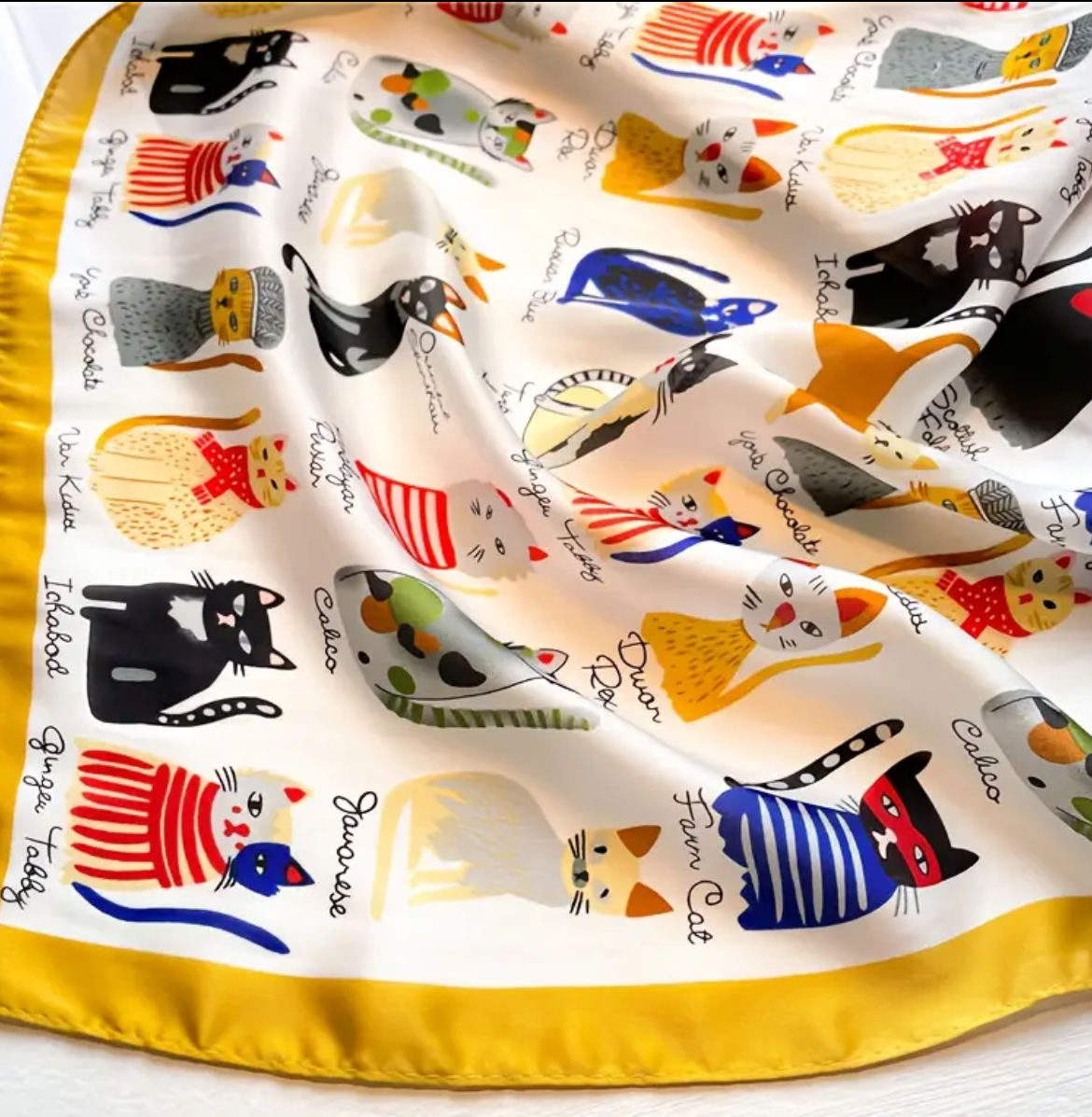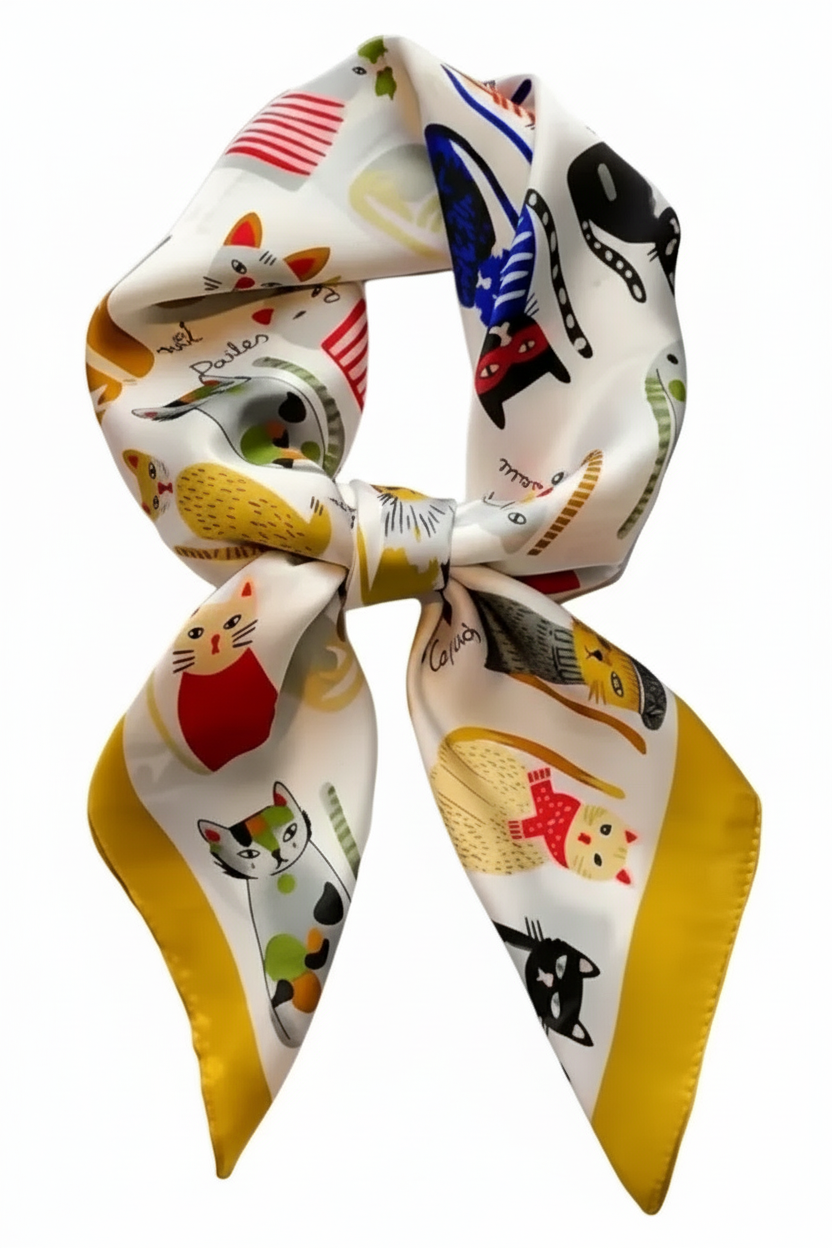 Hermoso y divertido pañuelo de gatitos disfrazados. Tamaño grande 90cm. Modelo cuadrado. Tela finita y liviana.