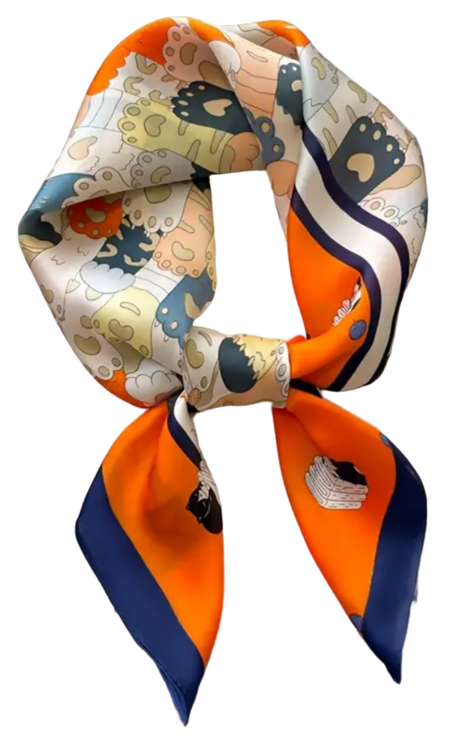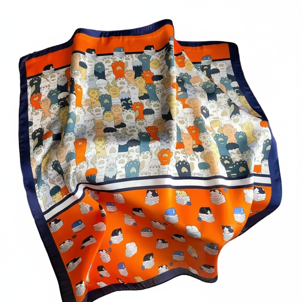 Hermoso pañuelo de tela satinada con diseño de huellitas y gatitos. Cuadrado. Medidas 70cm.