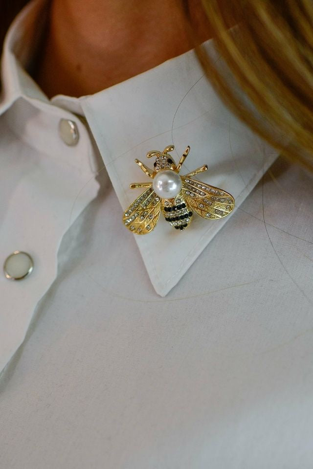 Prendedor broche con diseño de abeja y perla de fantasía en el medio. Fabricado en metal y atrás brillantes. Medidas aproximadas 3 x 3,5cm.