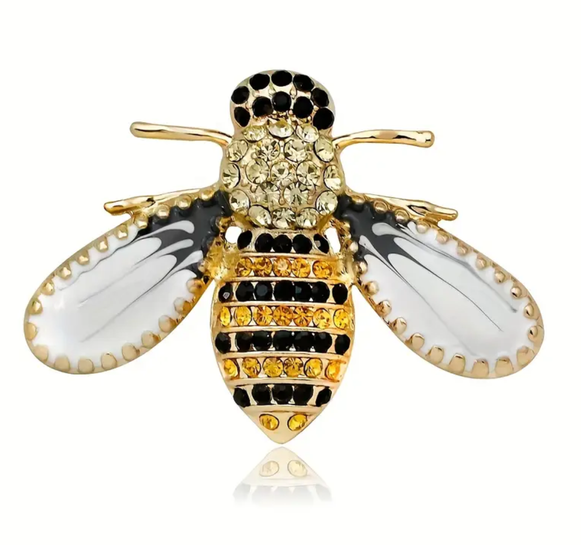 Hermoso y llamativo prendedor con diseño de abeja multi strass. Alas con resina blanca y vetas negras. Medidas aproximadas 4x3cm.