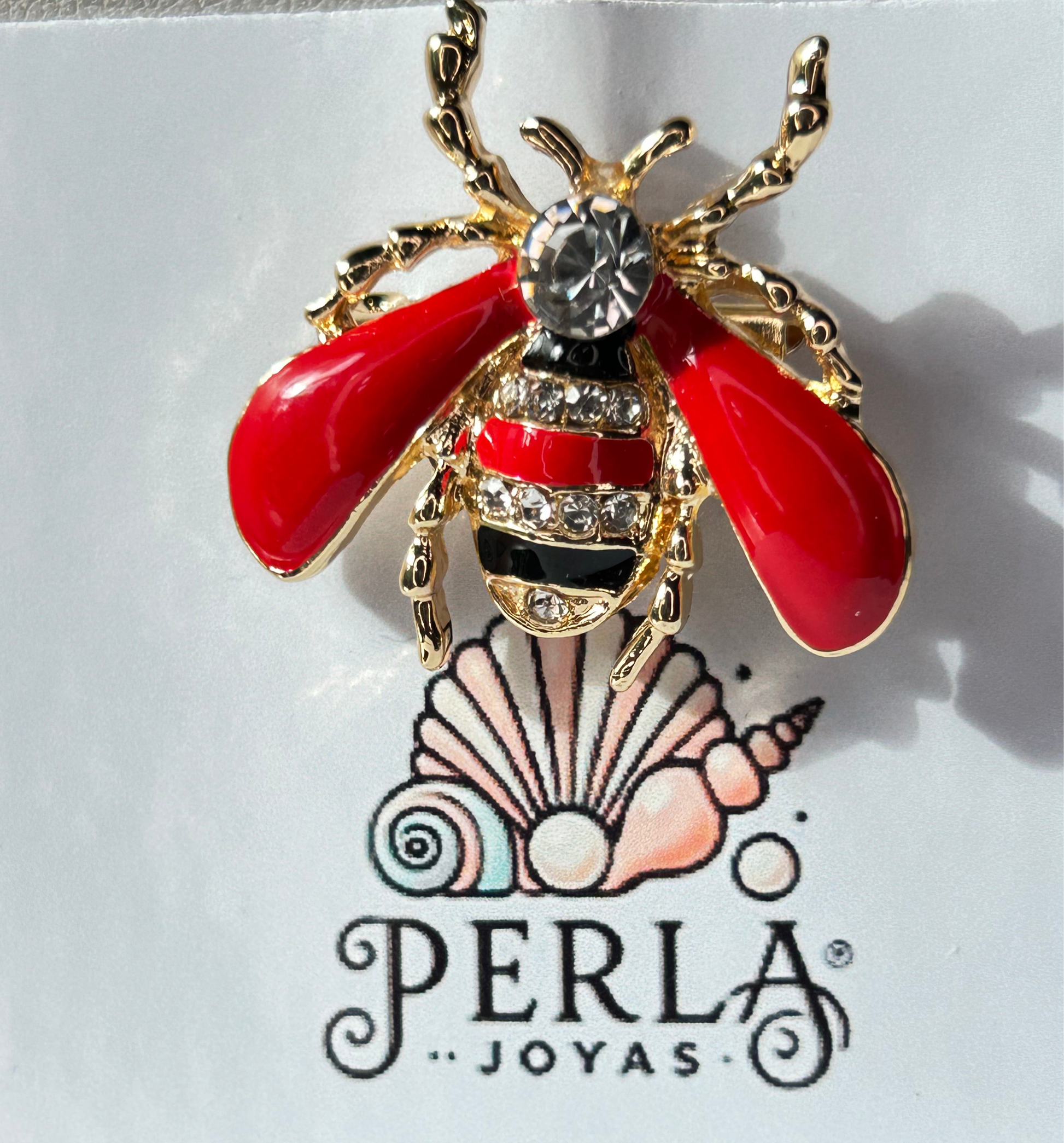Prendedor con diseño de avispa alas rojas. Strass en el cuerpo. Medida P. Tamaño aproximado 3x2,5cm.