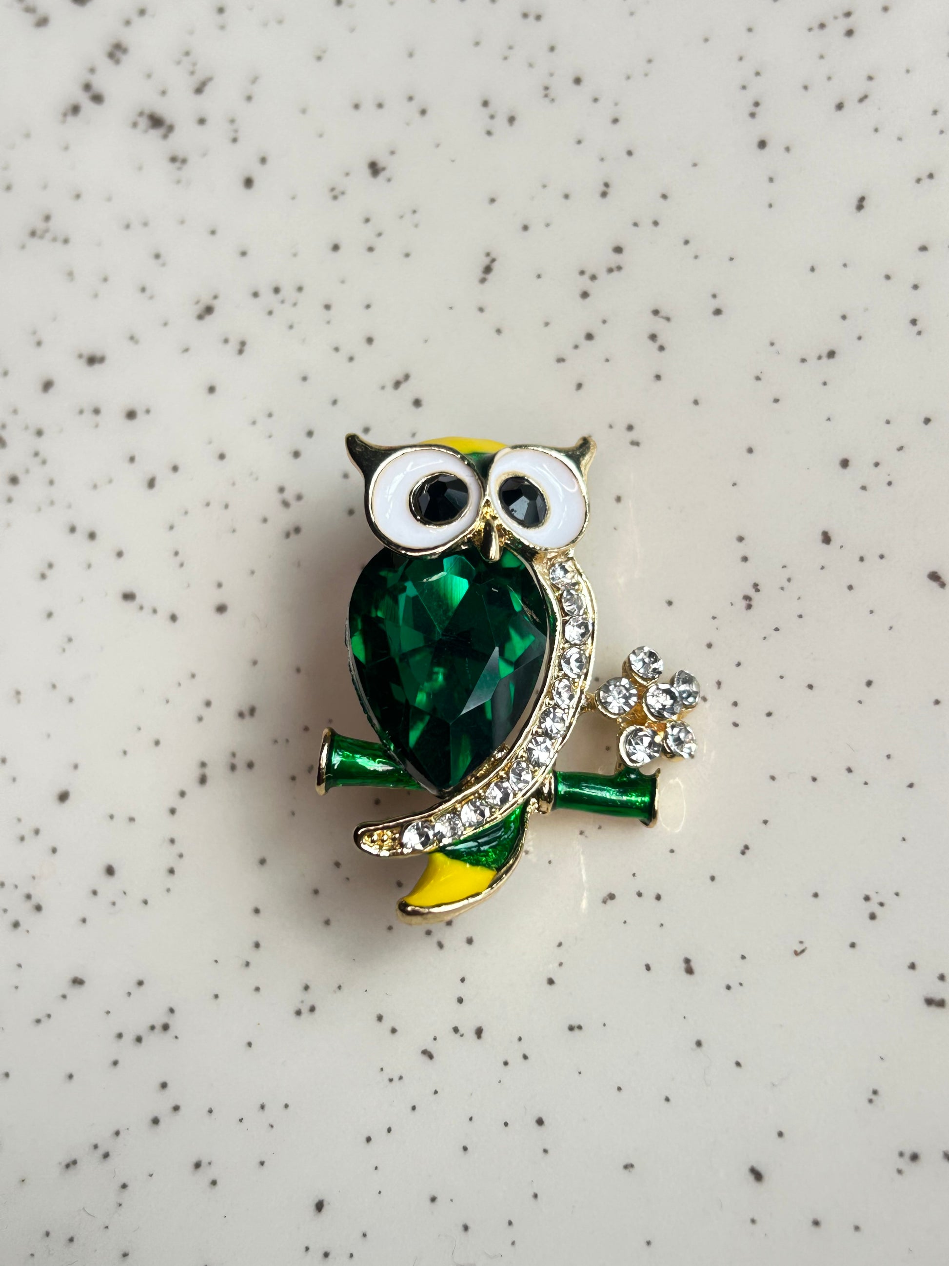 Prendedor con diseño de búho con strass verdes y brillantes. Medidas aproximadas 3,5 x 2,5cm.