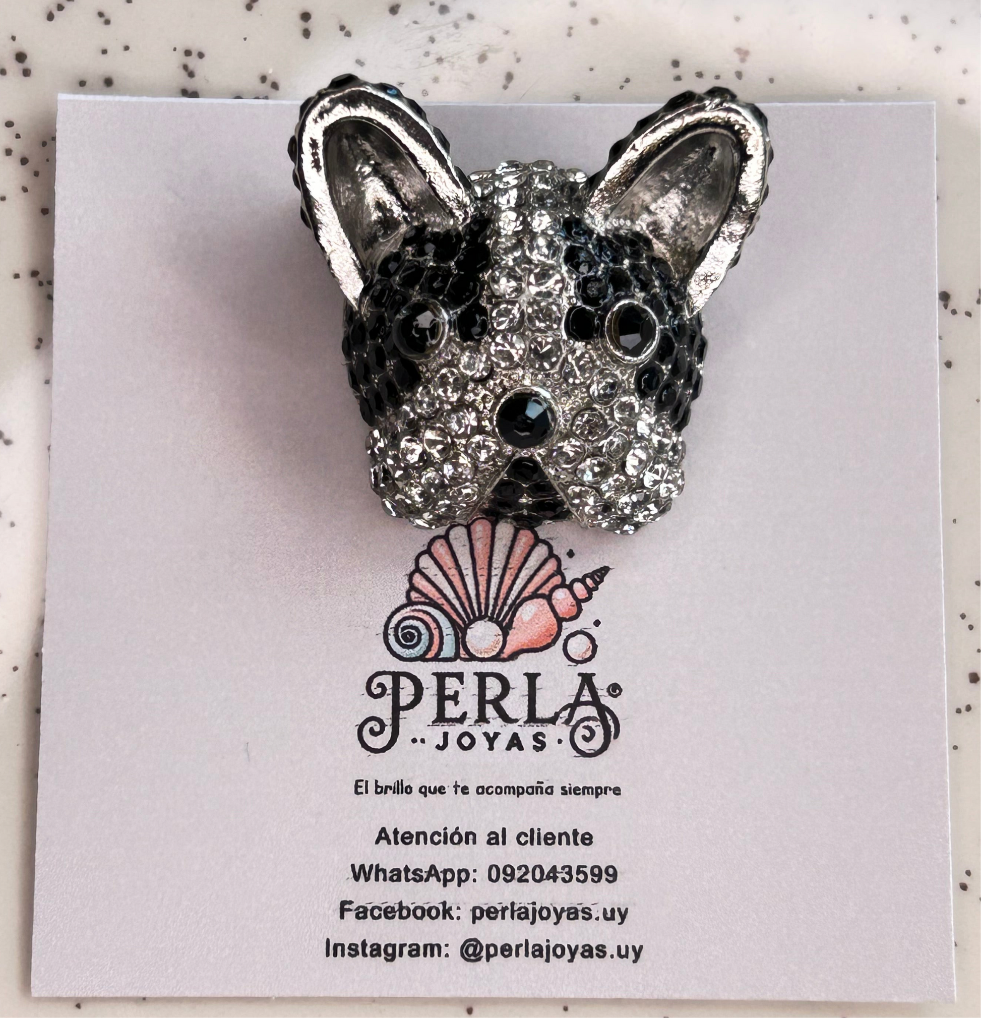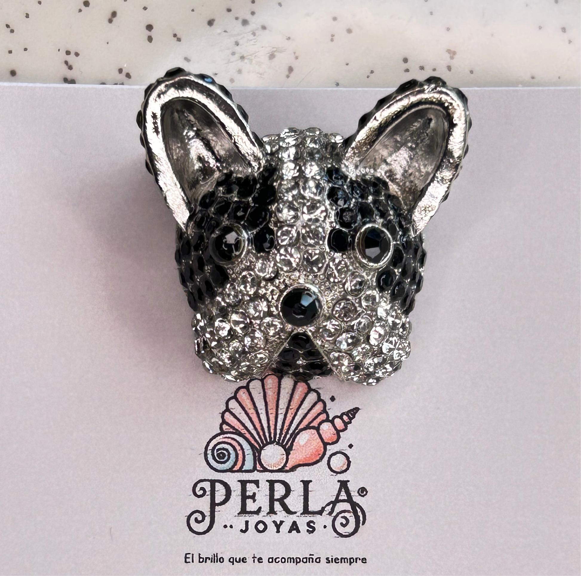 Prendedor con diseño bull dog con strass en cristal y negro. Fabricado en acero plateado . Tamaño P. Medidas aproximadas 3x3cm.