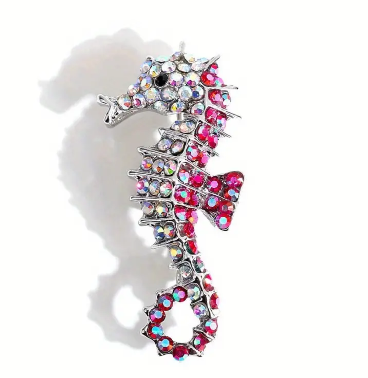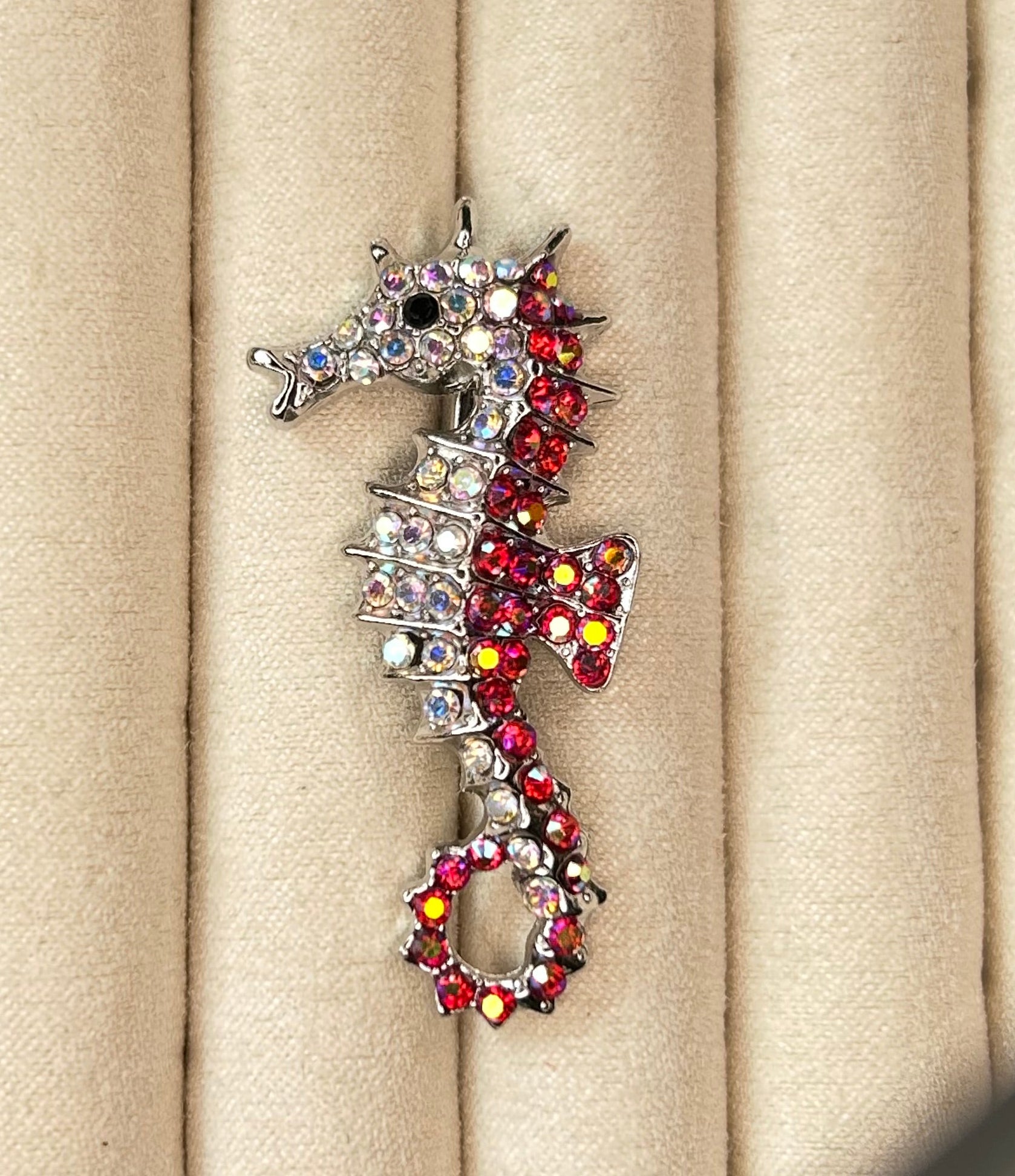 Prendedor con diseño caballito de mar y strass brillantes en tonos rojos. Medida M. Tamaño aproximado 4,2x2,5cm.