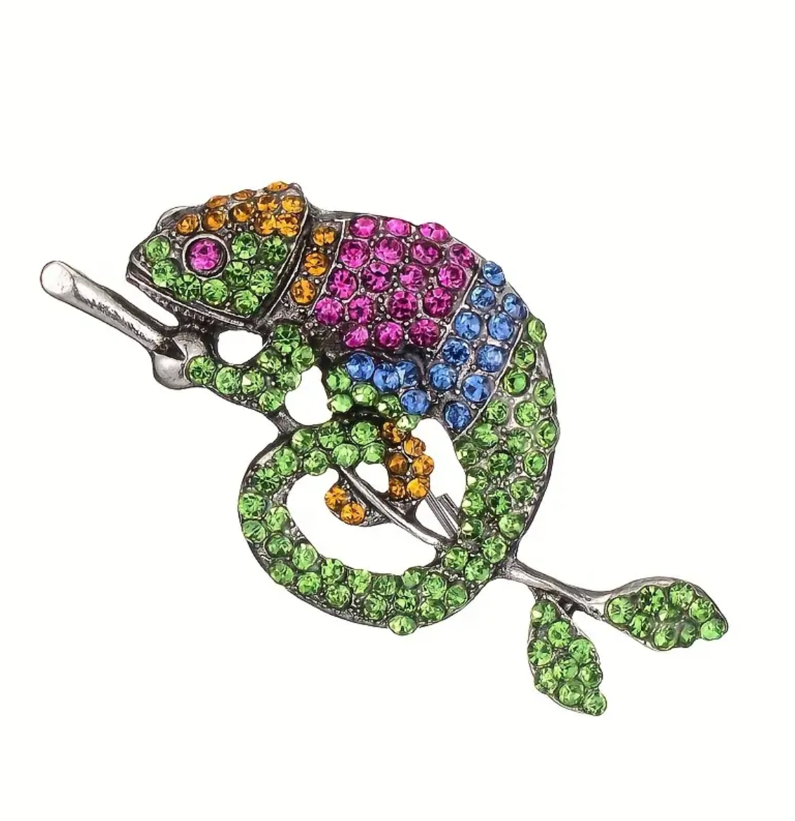 Prendedor broche elegante con diseño de camaleón. Fabricado con strass multicolores. Medidas aproximadas 5,4x2,8cm.