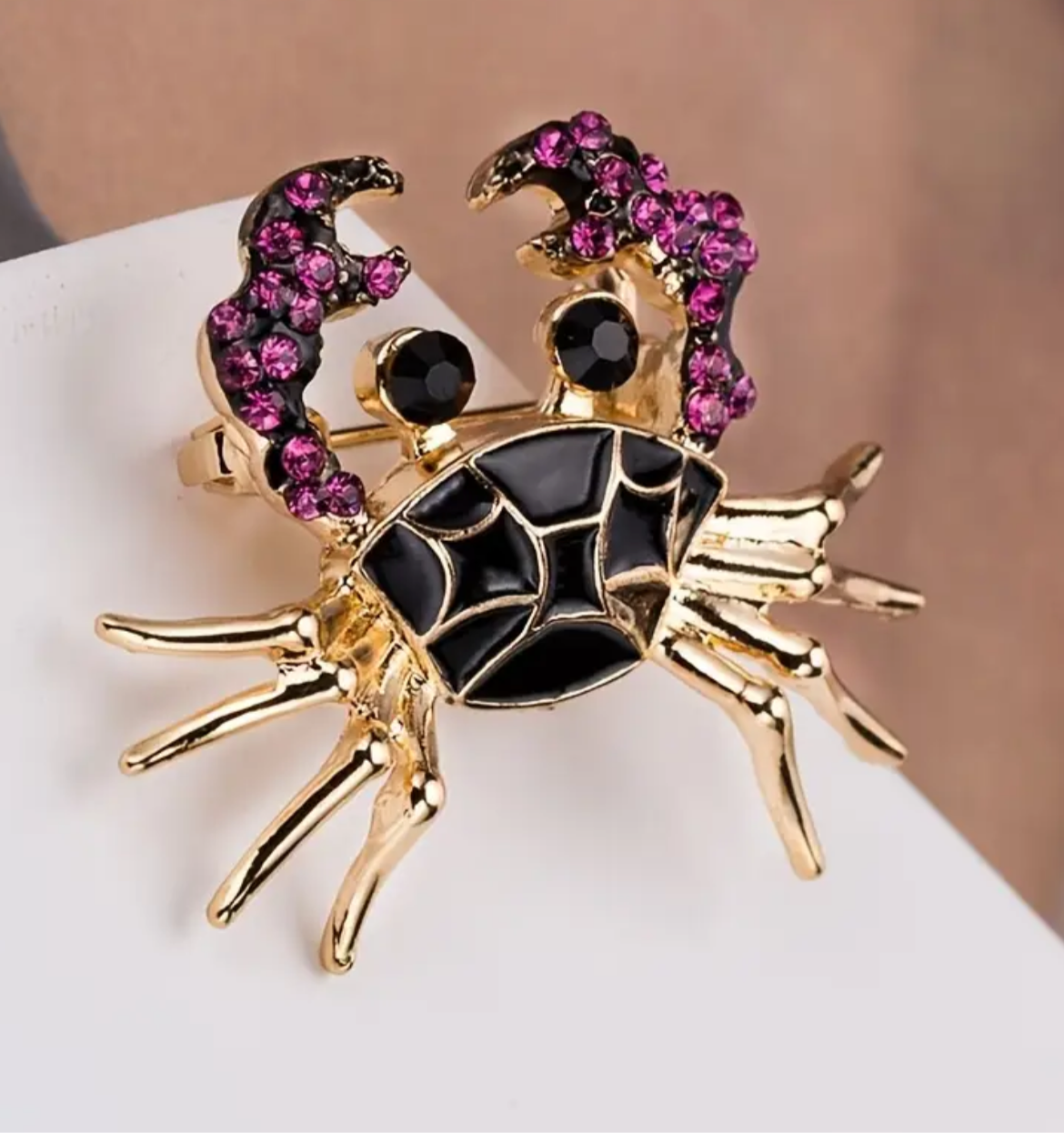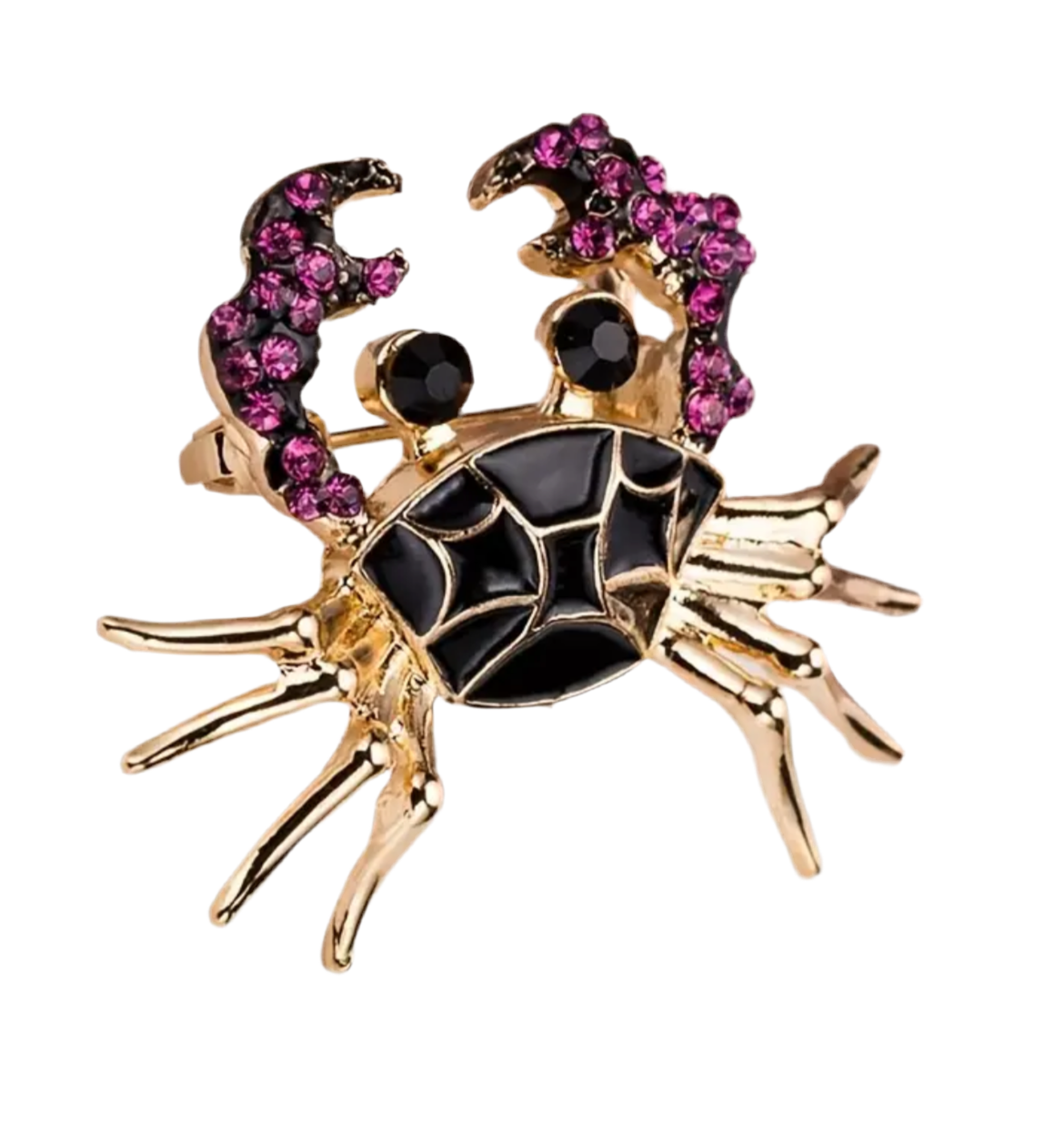 Broche de cangrejo de tono dorado elegante con diamantes de imitación rosa y negro, accesorio unisex. Tamaño P. Medidas aproximadas 3,2x2,6cm.