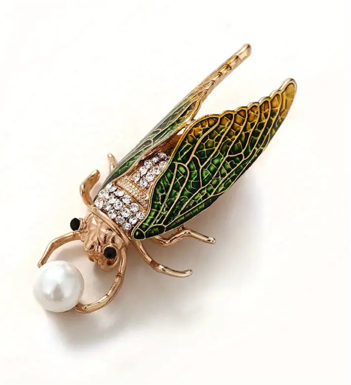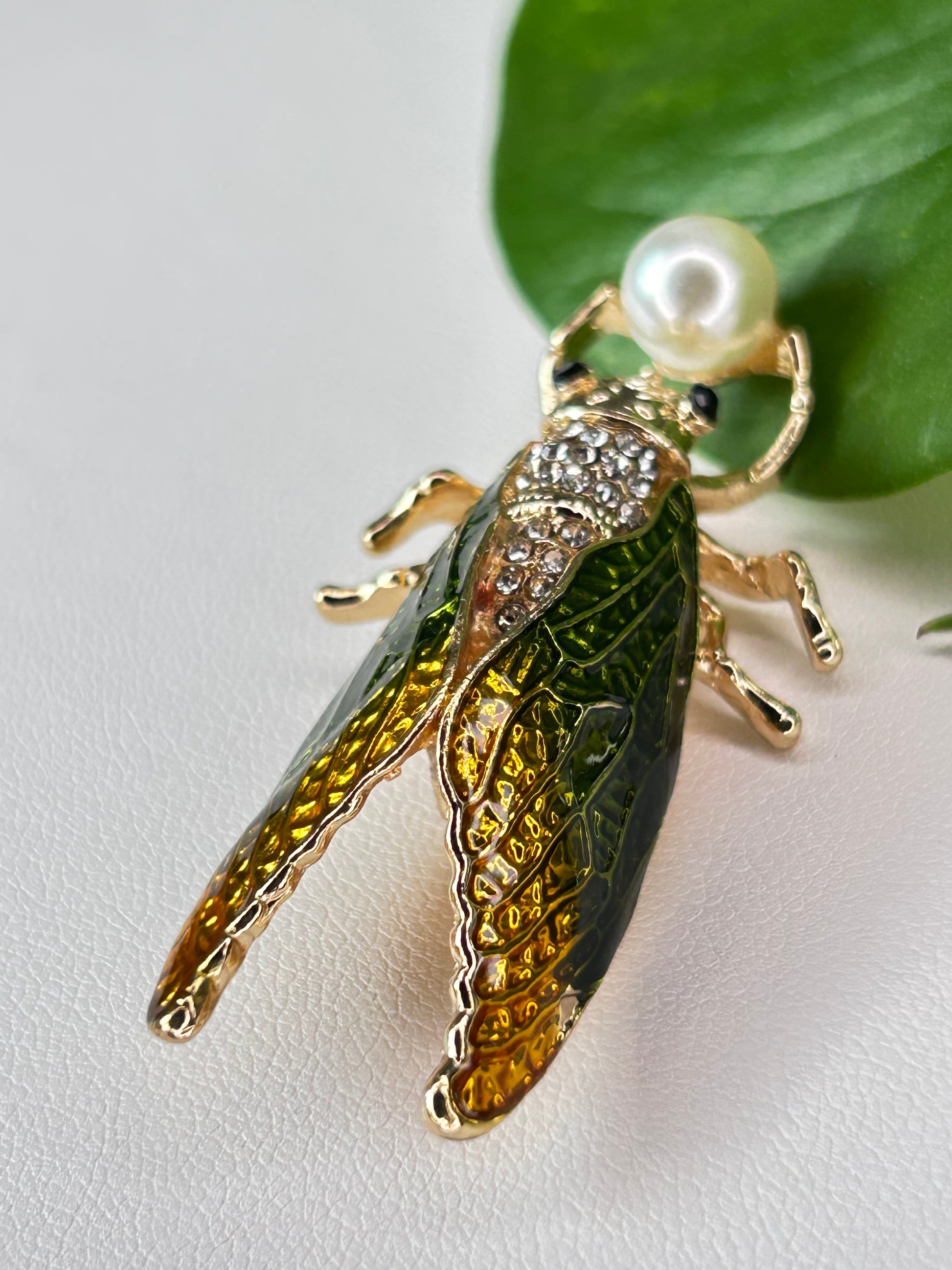 Hermoso y delicado broche prendedor con diseño de cigarra. Tonos dorados y verdes con perla de fantasía. Medidas aproximadas 5x2,5cm.