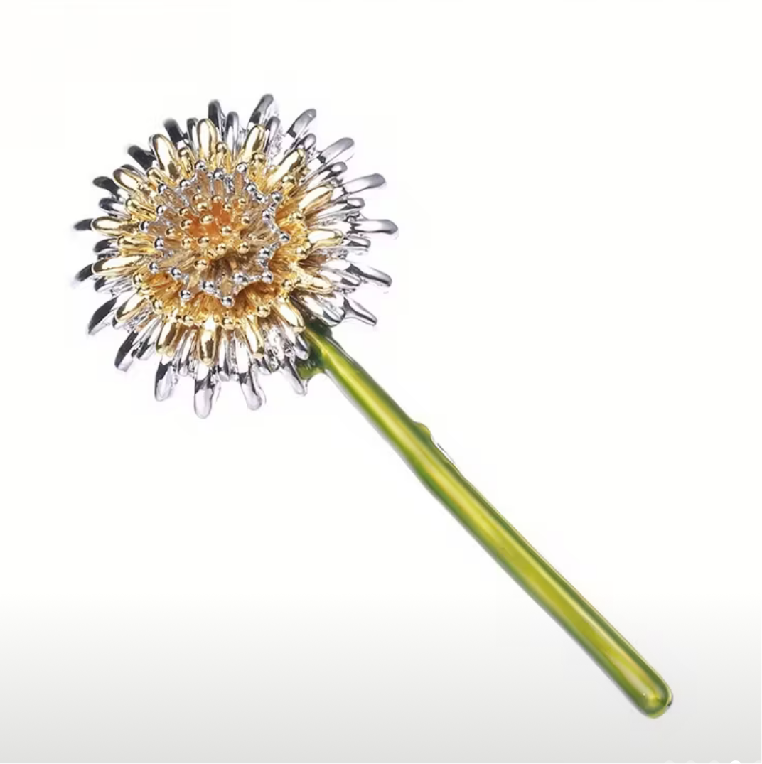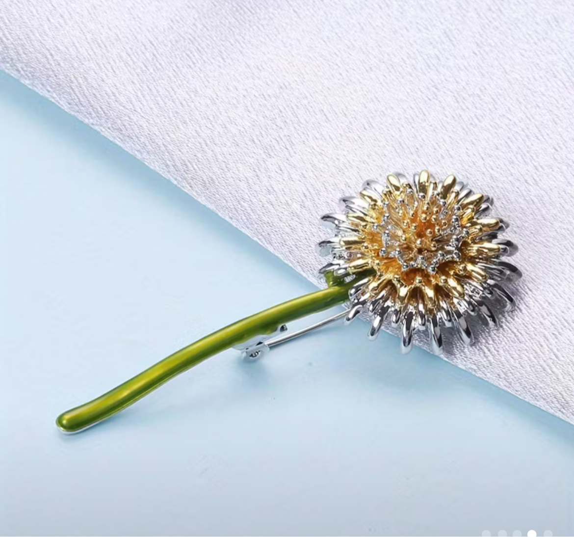 Delicado y elegante prendedor con diseño de flor diente de León. Tamaño M. Medidas aproximadas 6,8x2,8cm.