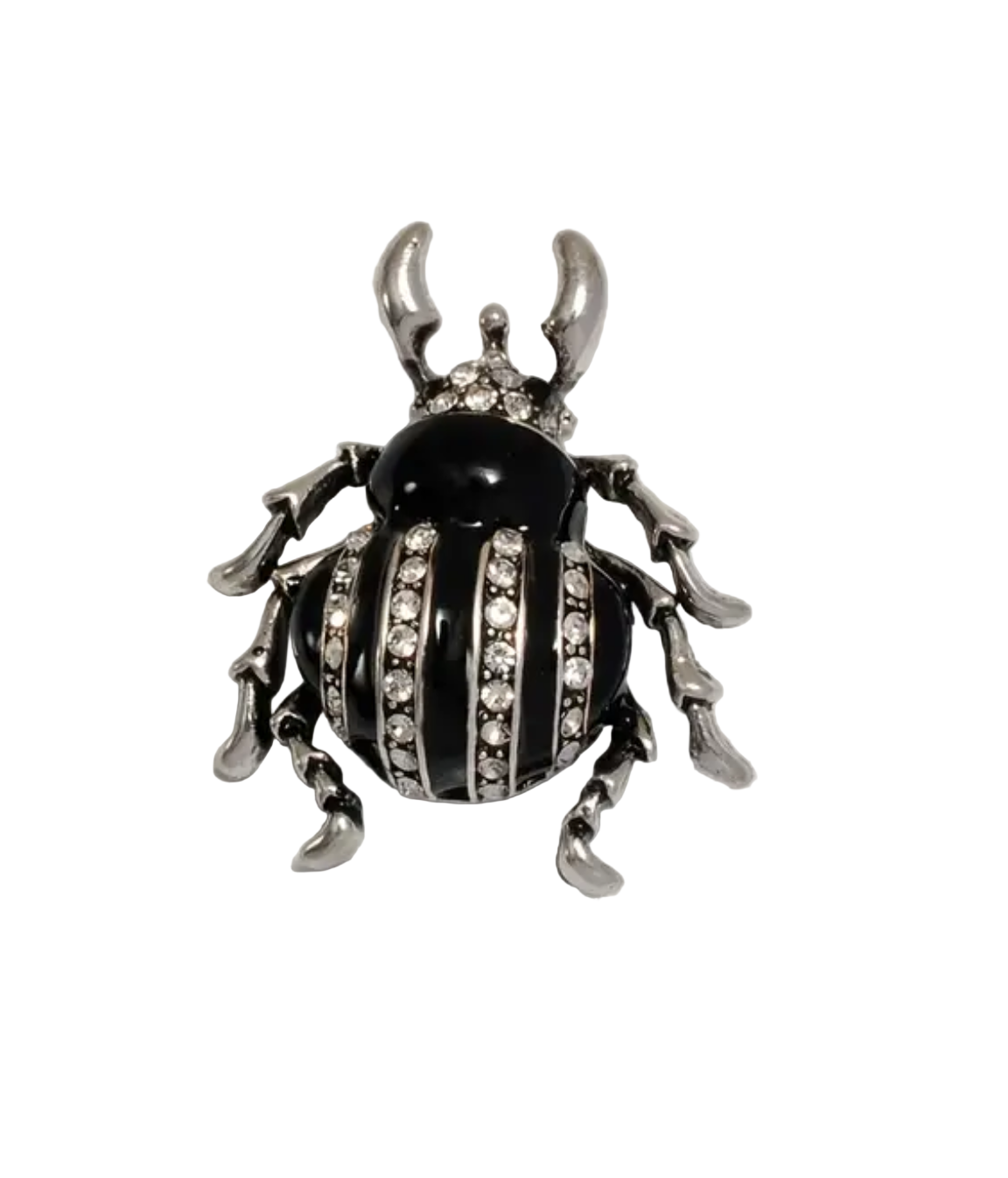 Delicado prendedor con diseño de escarabajo en colores blanco y negro con fila de strass. Tamaño P. Medidas aproximadas 2x2cm.