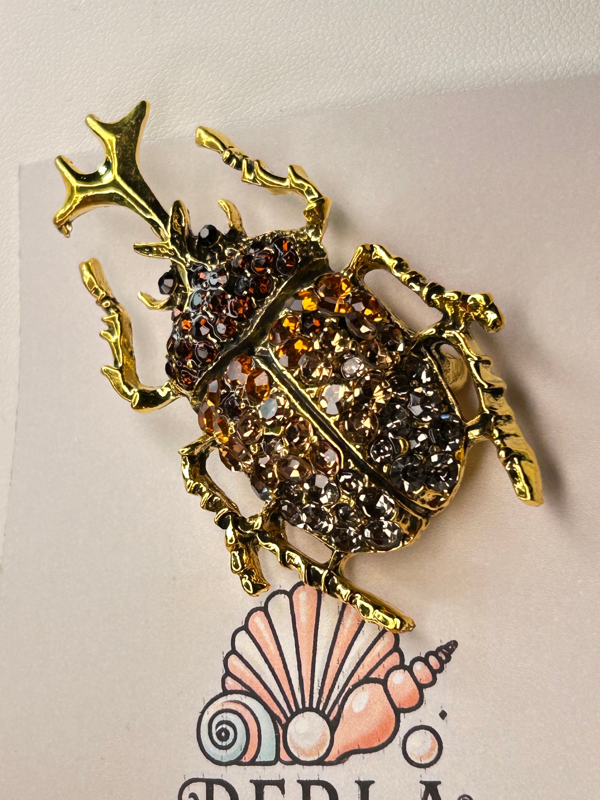 Prendedor con diseño de escarabajo en tonos ocres y naranja. Estilo vintage. Acero dorado. Tamaño XL . Medidas aproximadas 6x3cm.