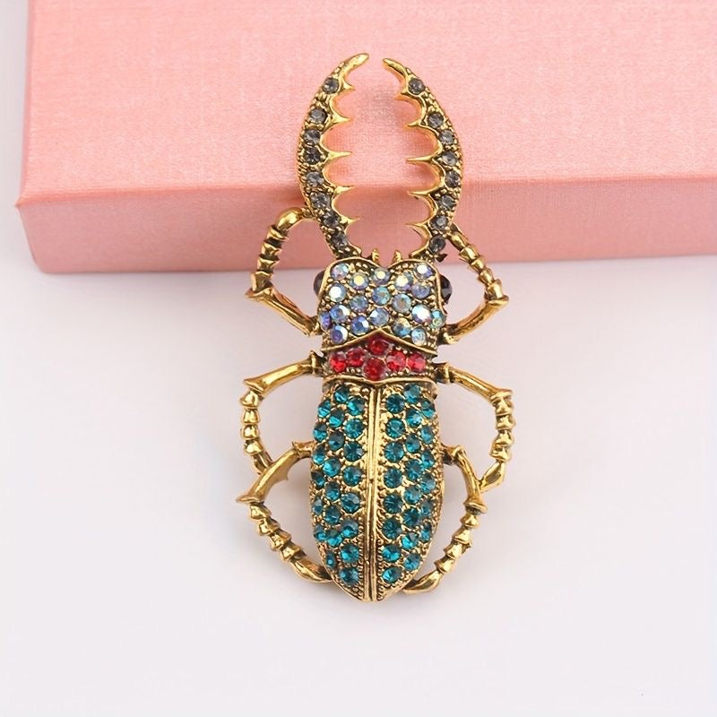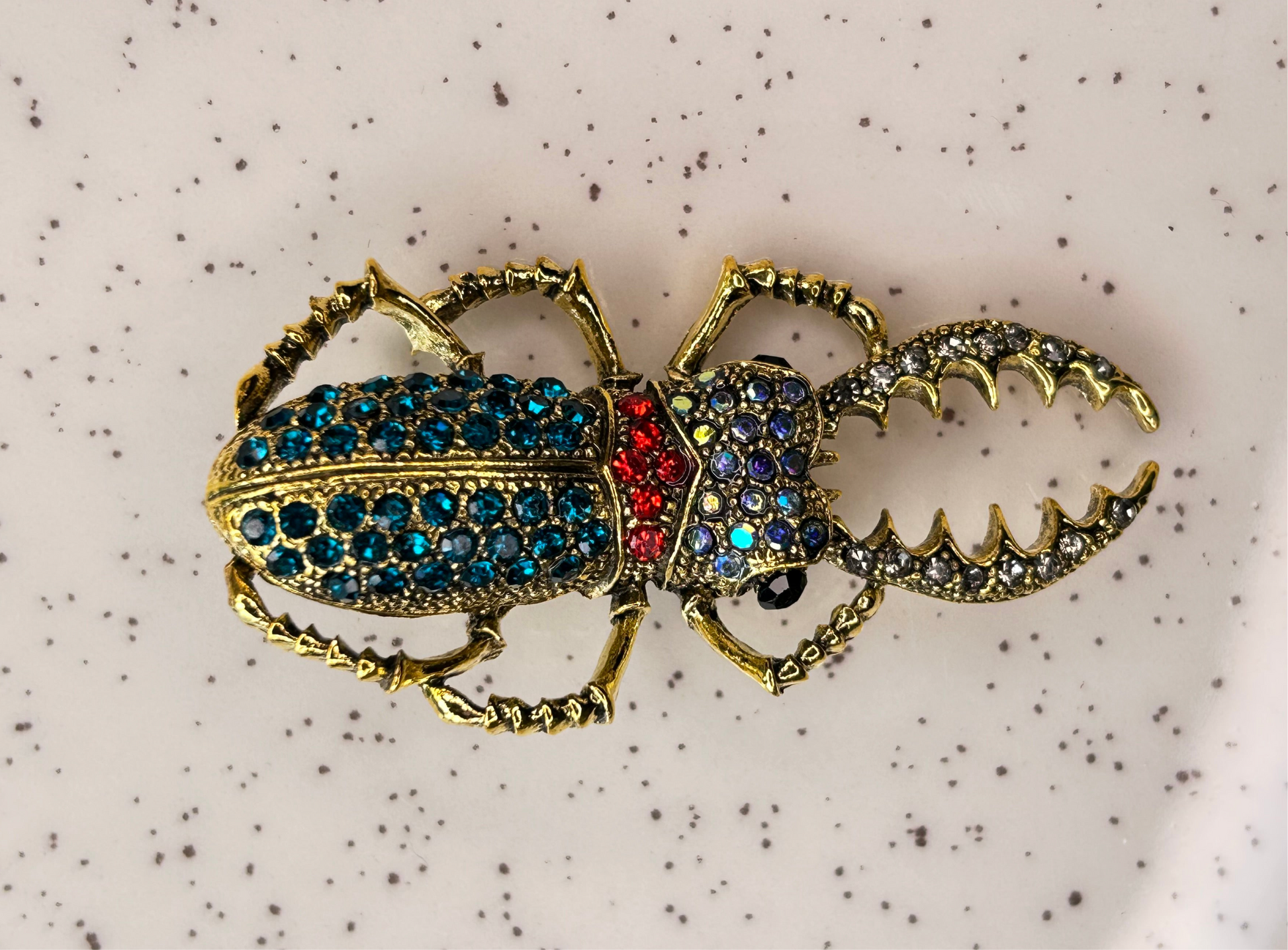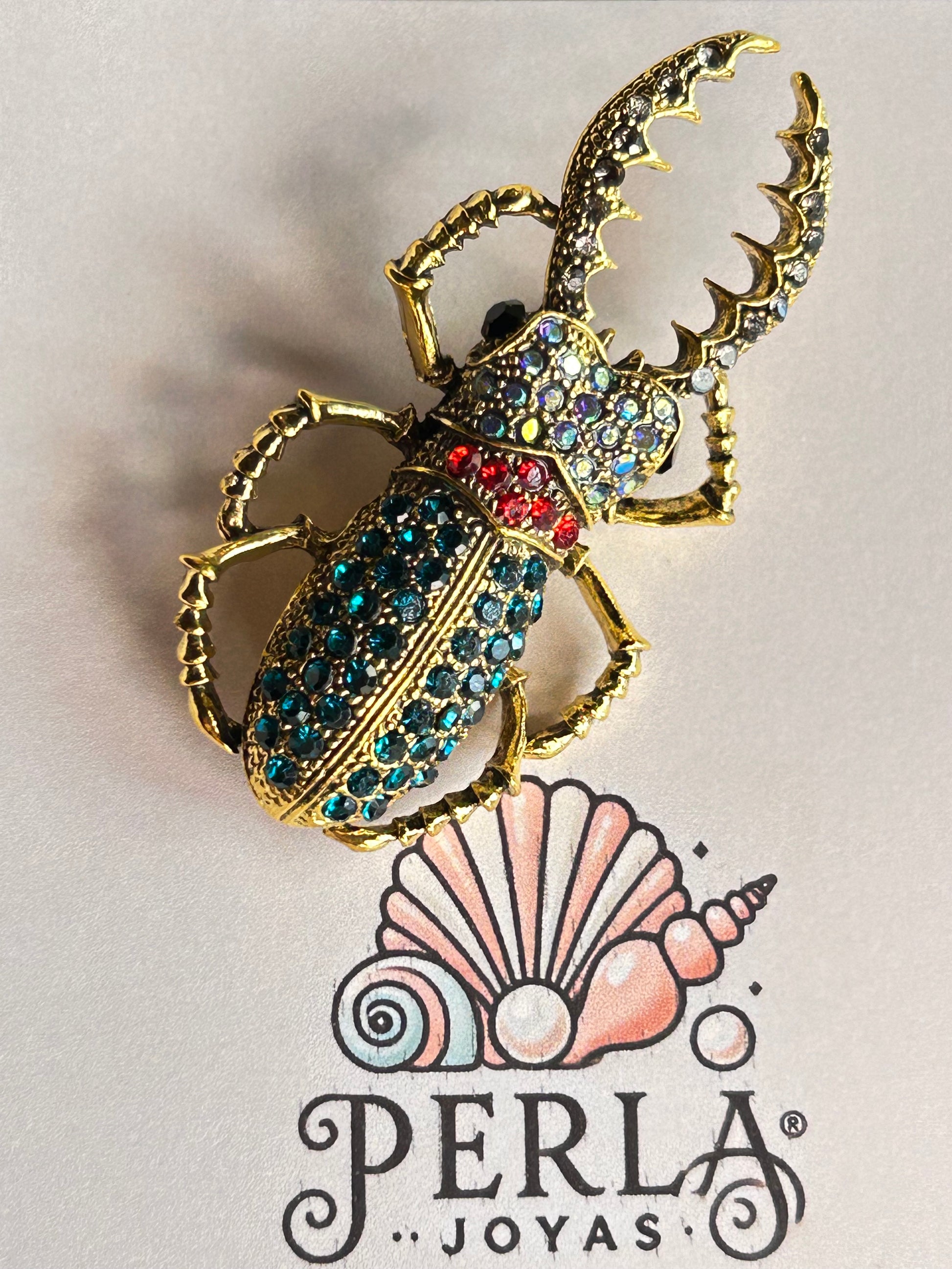 Prendedor con diseño de escarabajo pinzas. Colores brillantes y fondo dorado. Tamaño M. Medidas aproximadas 5x2,5cm.