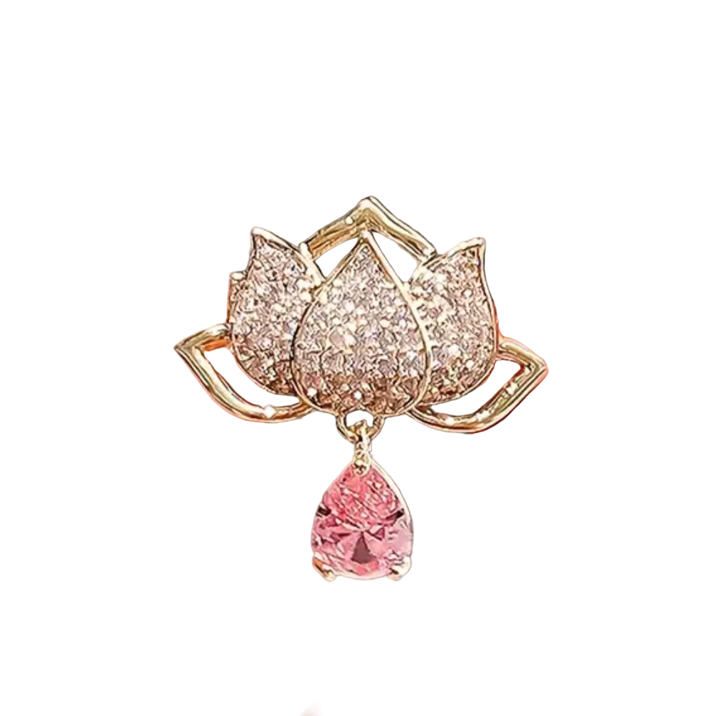 Delicado prendedor con diseño de flor de loto y circonias cristal con gota color rosa. Tamaño P. Medidas aproximadas 2,7x2,4cm.