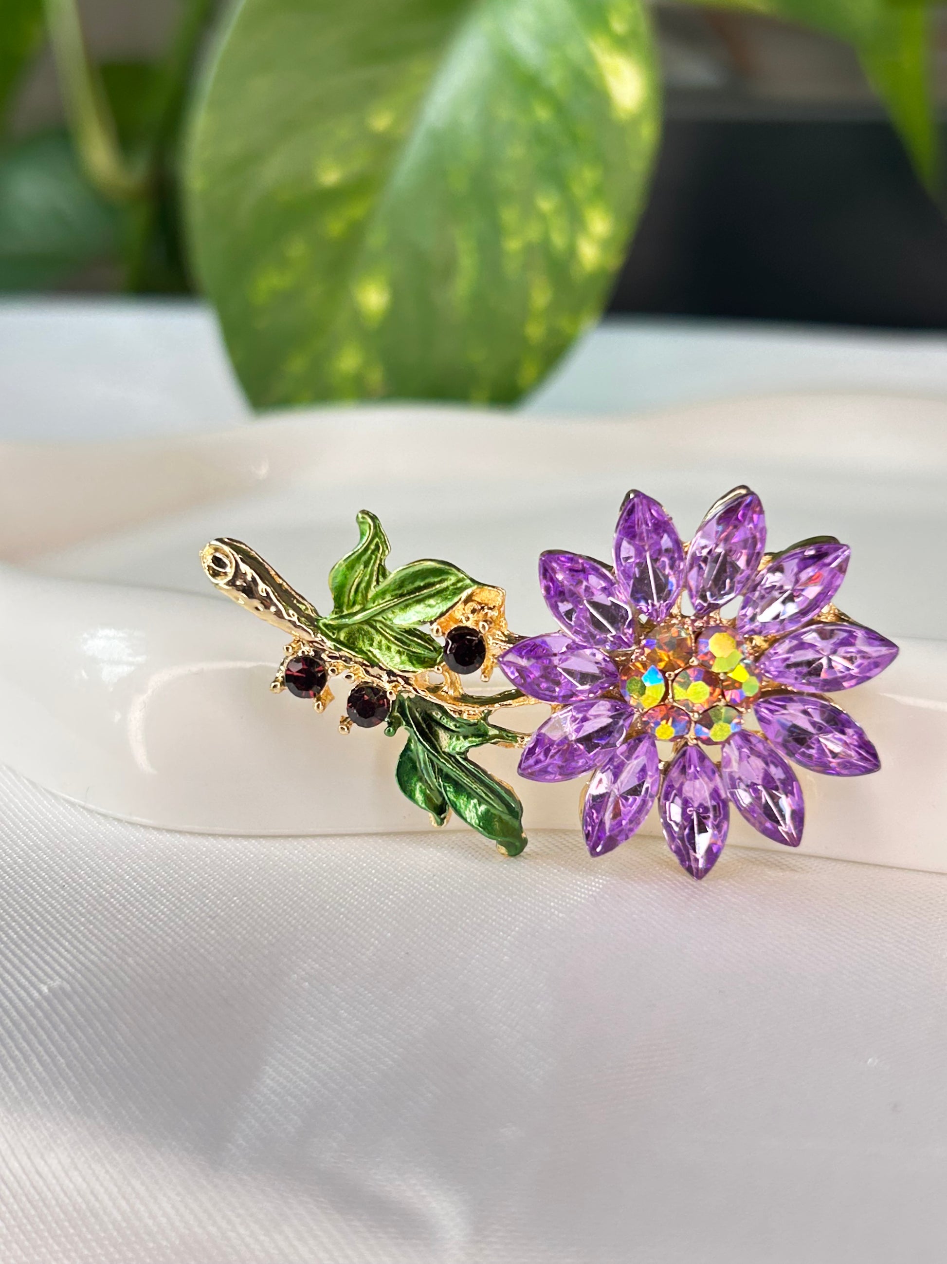 Hermoso prendedor con diseño de flor y brillantes violetas. Tamaño M. Medidas aproximadas 5,5x 3,8cm.