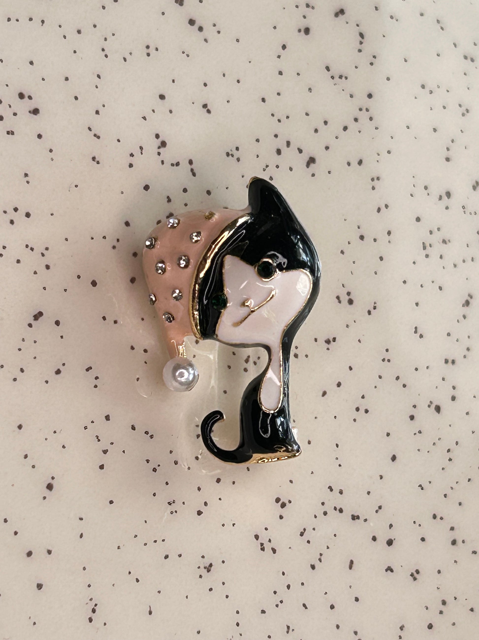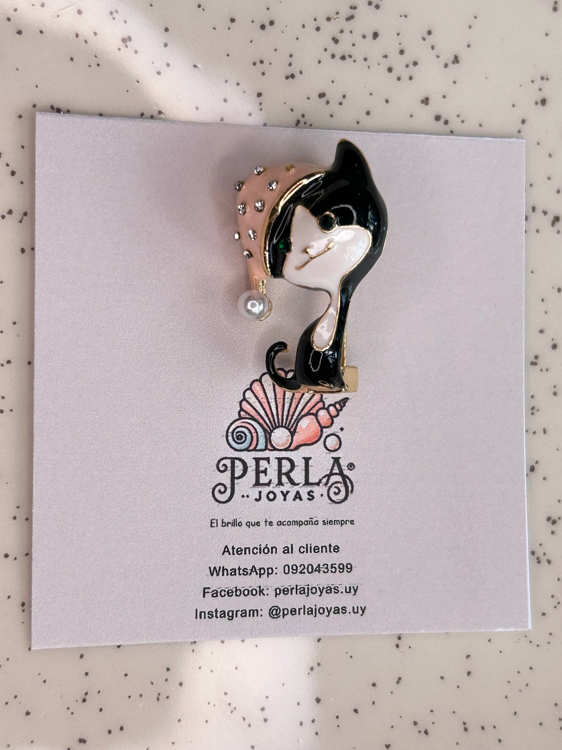 Prendedor muy delicado con diseño de gatito con gorro y detalle de perlita en la punta. Modelo esmaltado. Tamaño P. Medidas aproximadas 3x2cm.