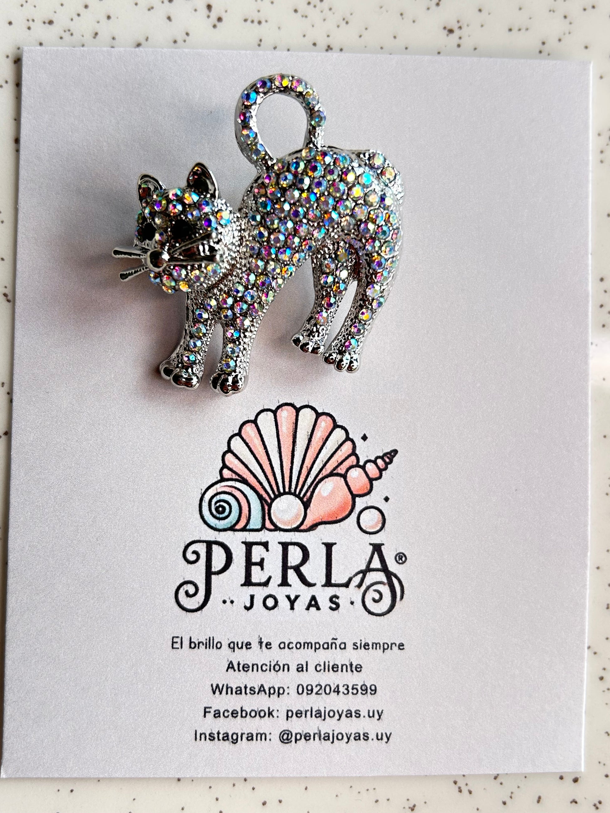 Prendedor diseño de gato cubierto con strass cristales que al darle el sol hace efecto tornasolado. Medida M. Tamaño aproximado 5x6cm.