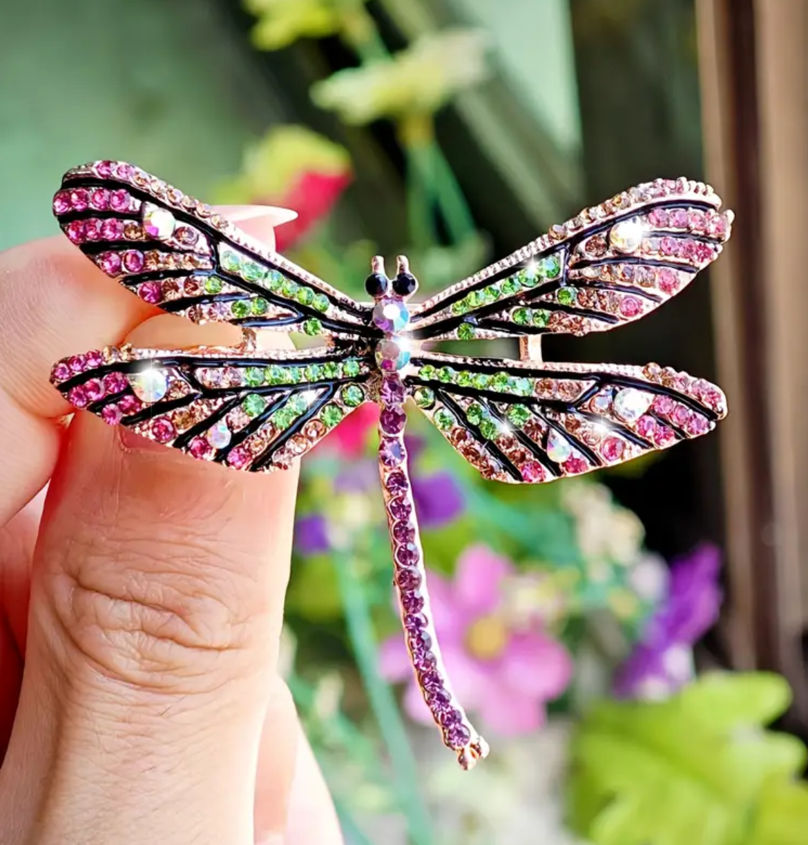 Prendedor con diseño de libélula en brillos rosas y verdes. Medidas aproximadas 4,5x6,5cm.
