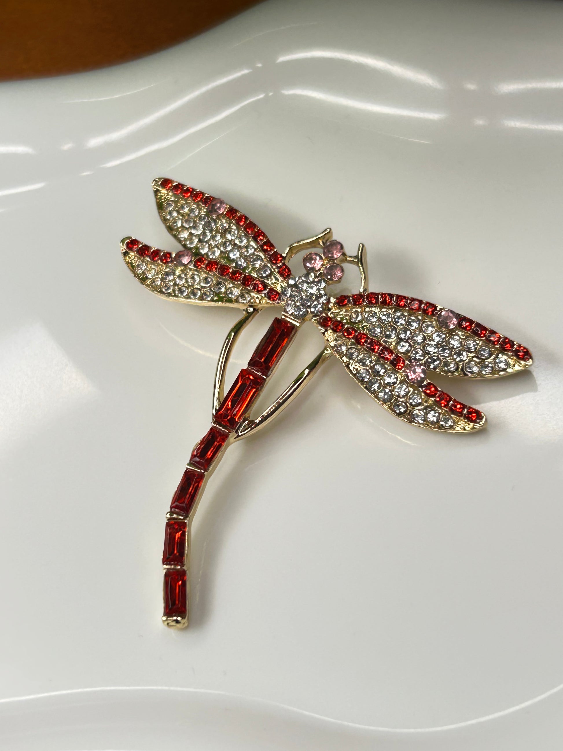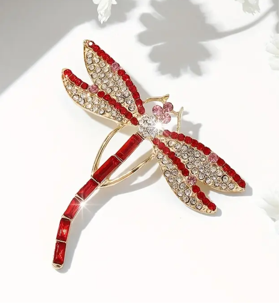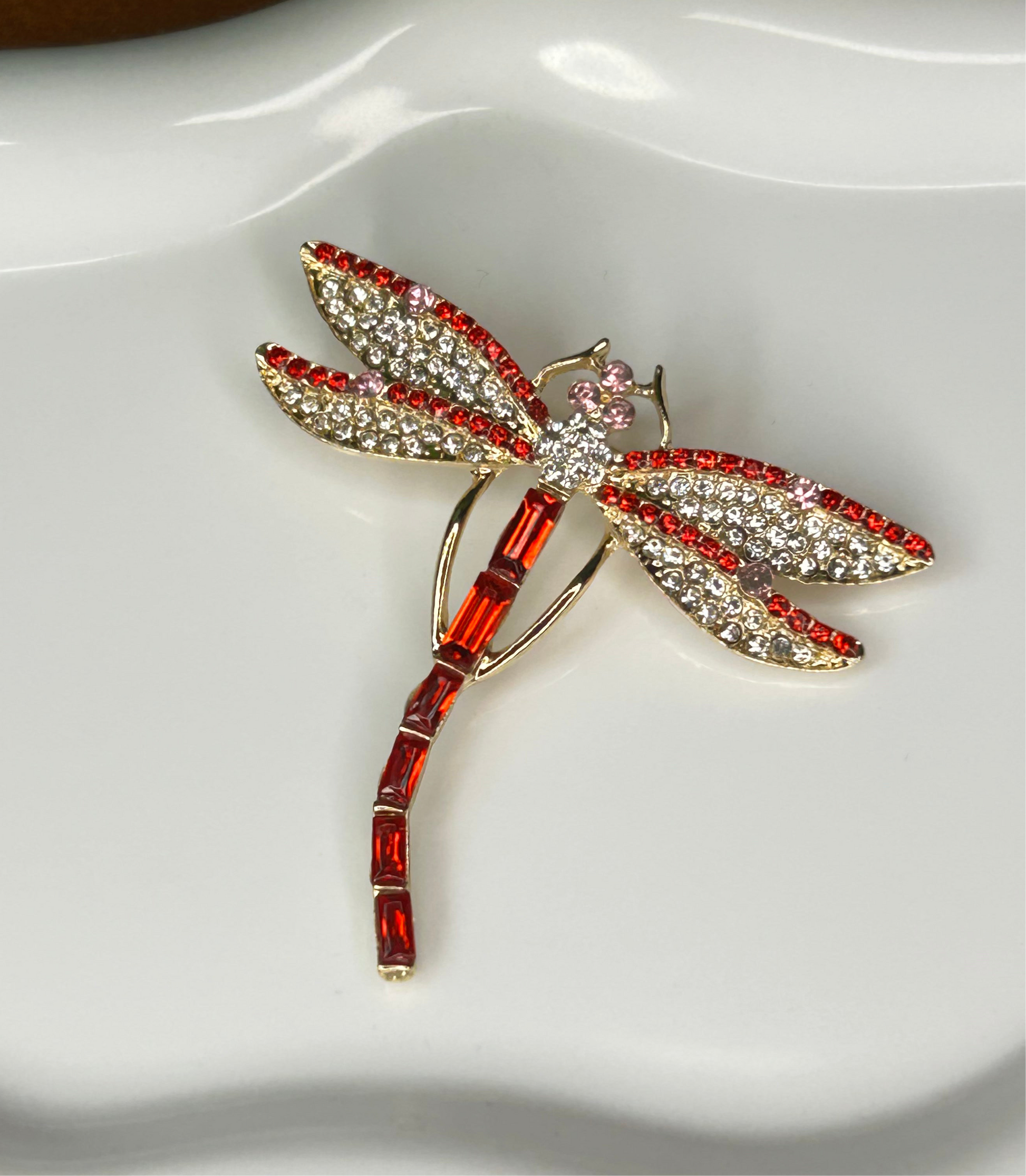 Hermoso prendedor de libélula en tonos rojizos. Con strass super brillantes. Medidas aproximadas 5x5cm.