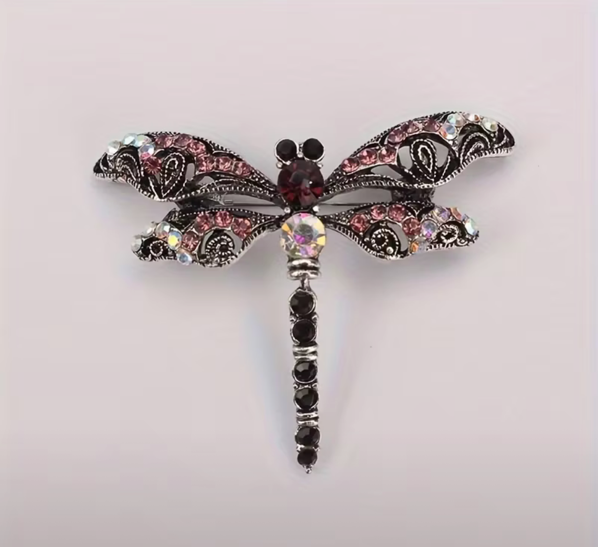 Hermoso prendedor con diseño de libélula con strass negros y rojos. Cola móvil para un toque de movilidad único. Tamaño L. Medidas aproximadas 6x5,3cm.