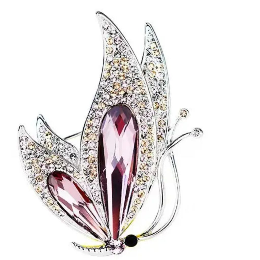 Prendedor broche con diseño de mariposa en vuelo. Fabricado en metal de alta calidad y detalles de strass brillantes. Medidas aproximadas 4x2,5cm.