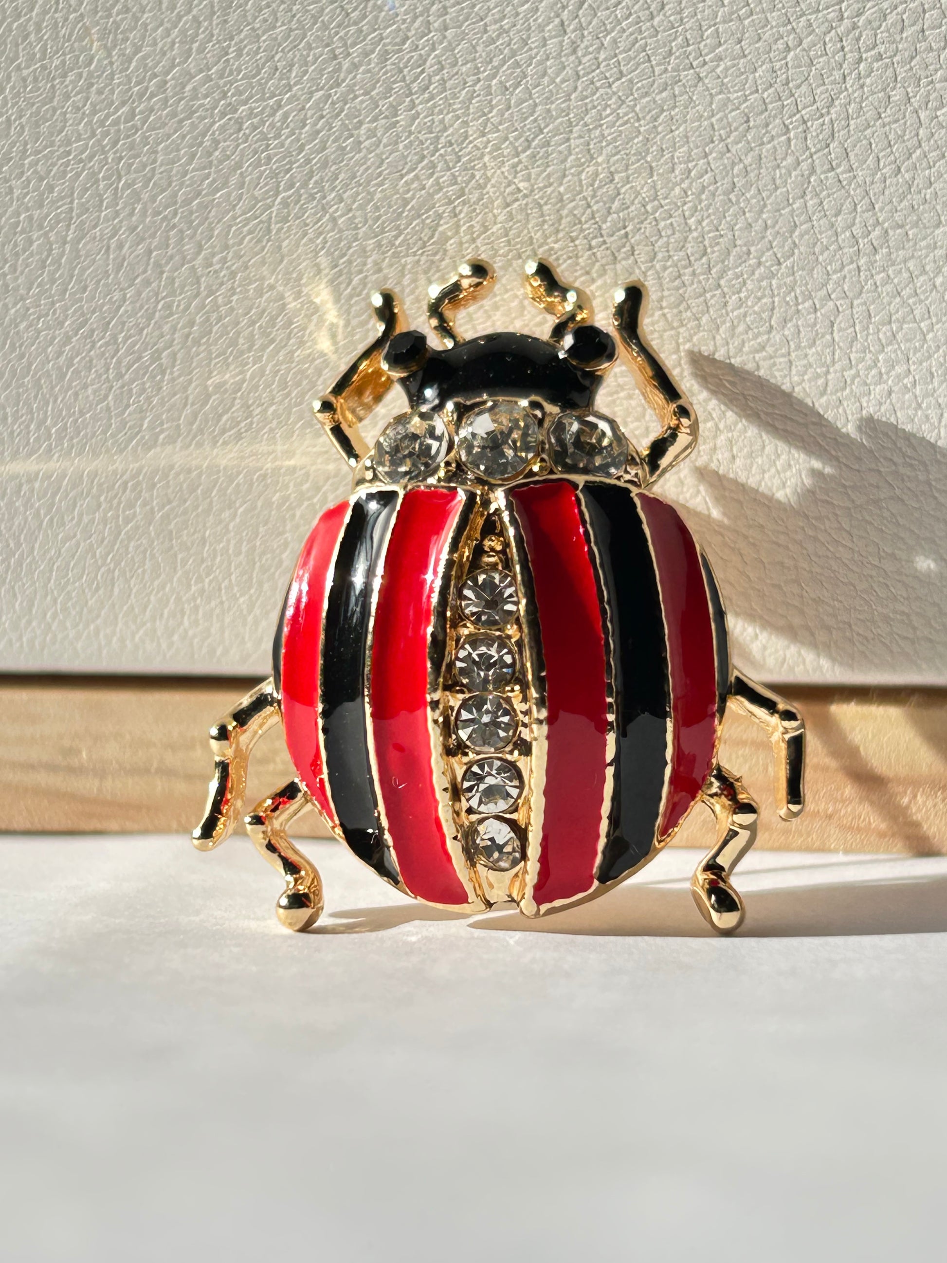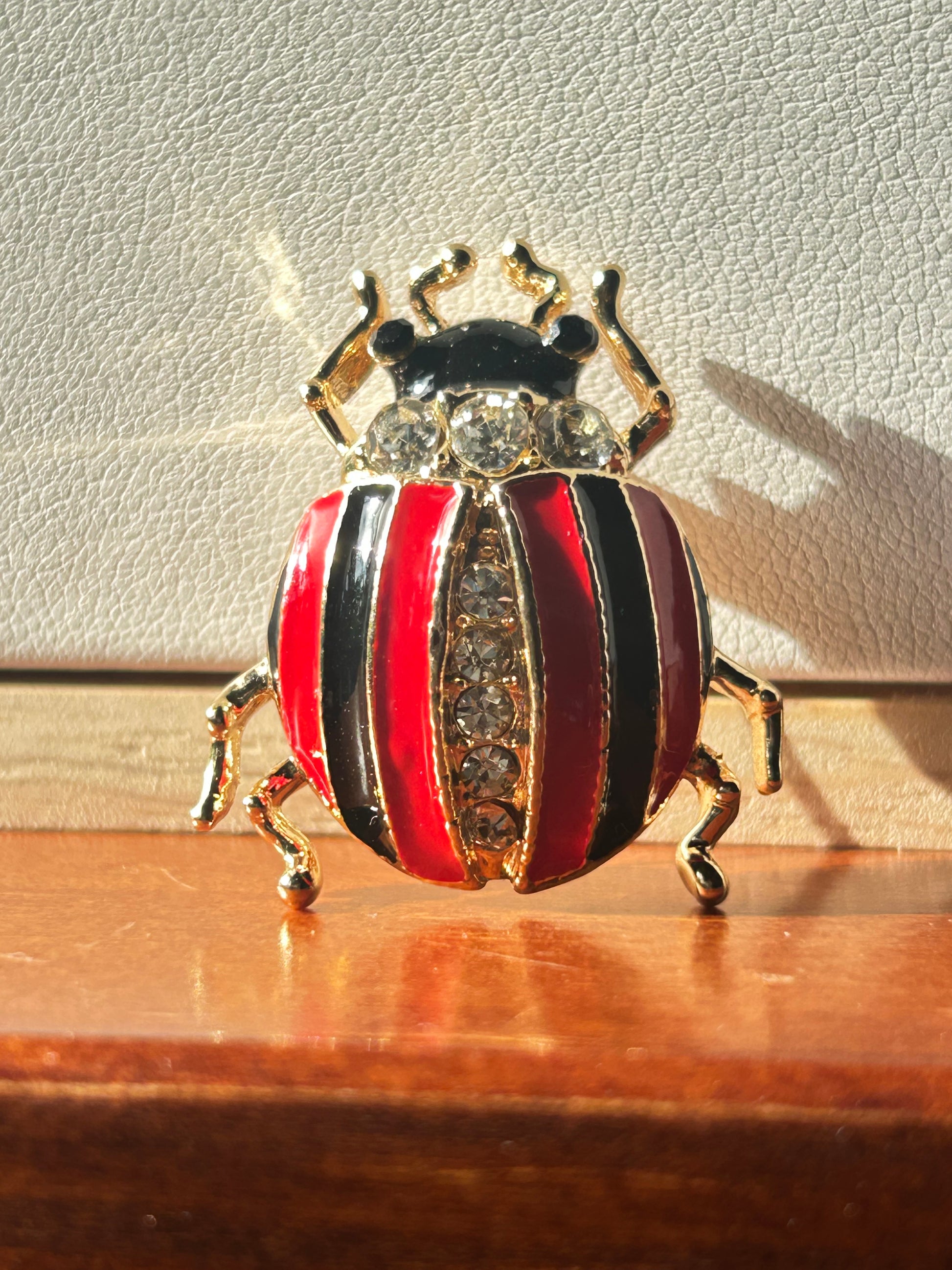 Prendedor con diseño de mariquita a rayas y líneas de strass. Tamaño M. Medidas aproximadas 3x2,5cm.