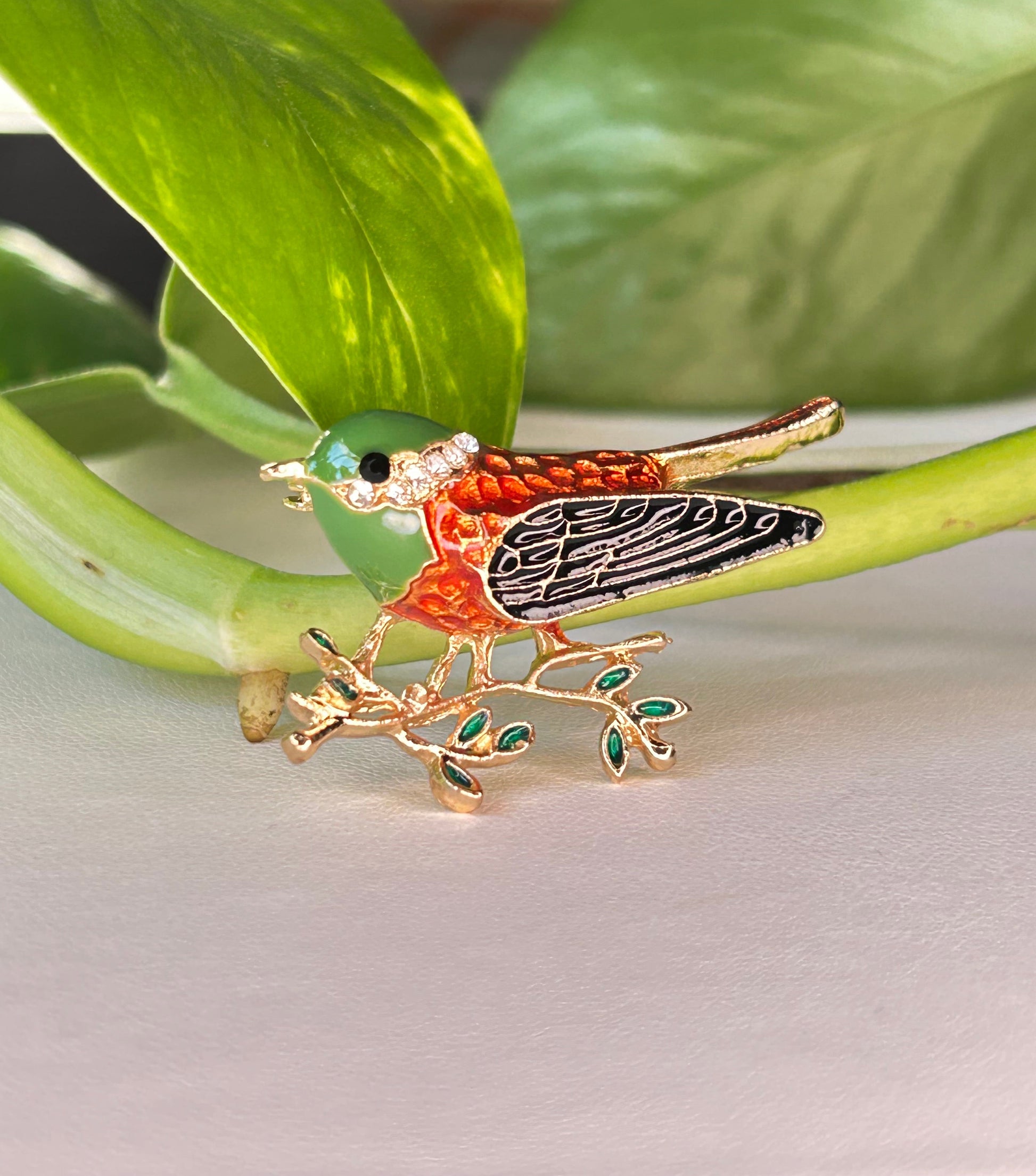 Delicado prendedor unisex con modelo de pajarito. Esmaltes, verde y rojo con circonias brillantes. Medidas aproximadas 3,5x2cm.