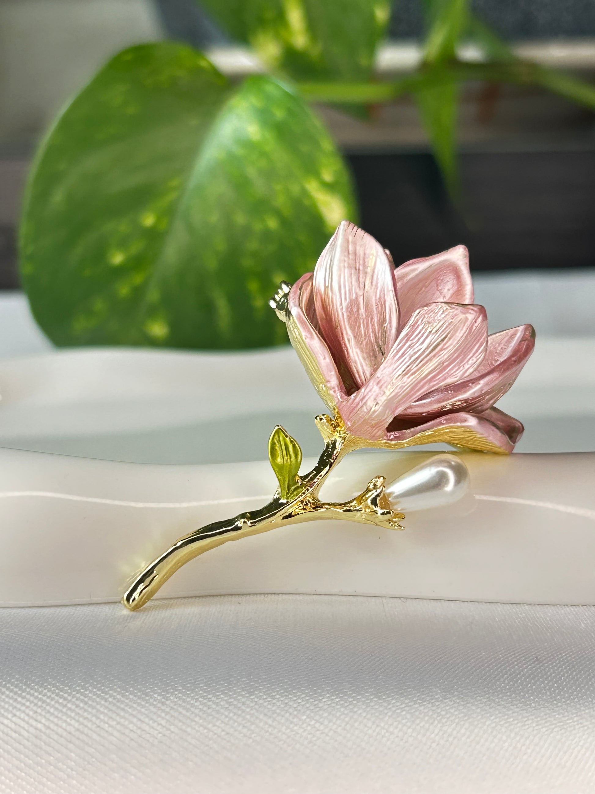 Hermoso y delicado prendedor con diseño de Flor rosa y perla. Tamaño M. Medidas aproximadas 3,8x5,5cm.