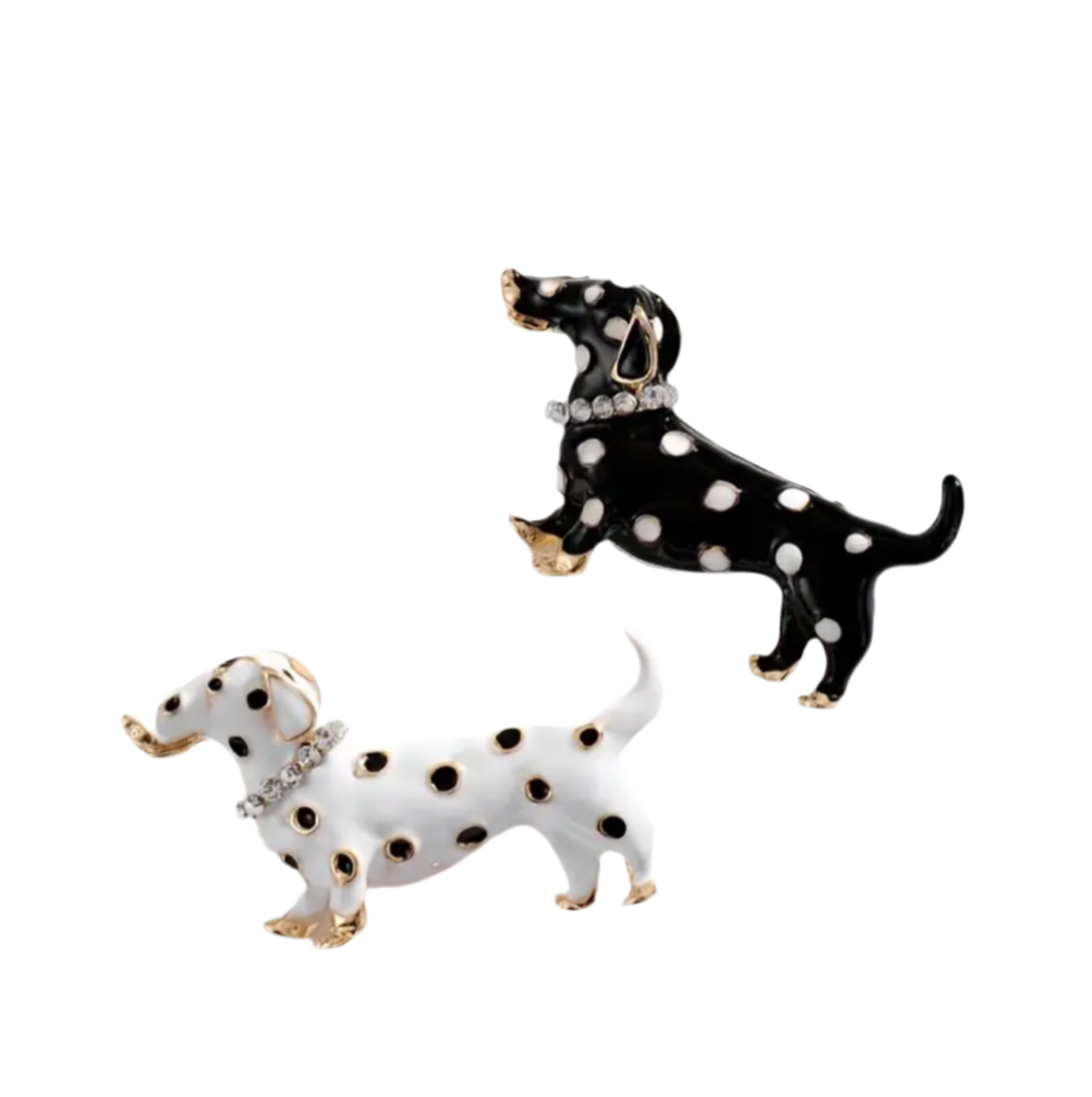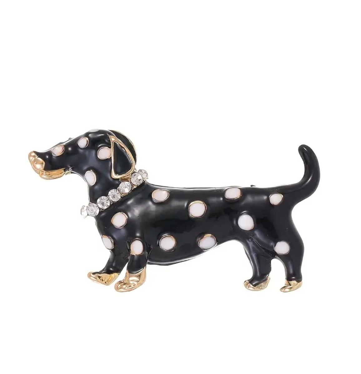 Broche adorable de perro salchicha en blanco y negro con lunares y cristales, elegante prendedor de animal. Medidas aproximadas 4,5x2,5cm.