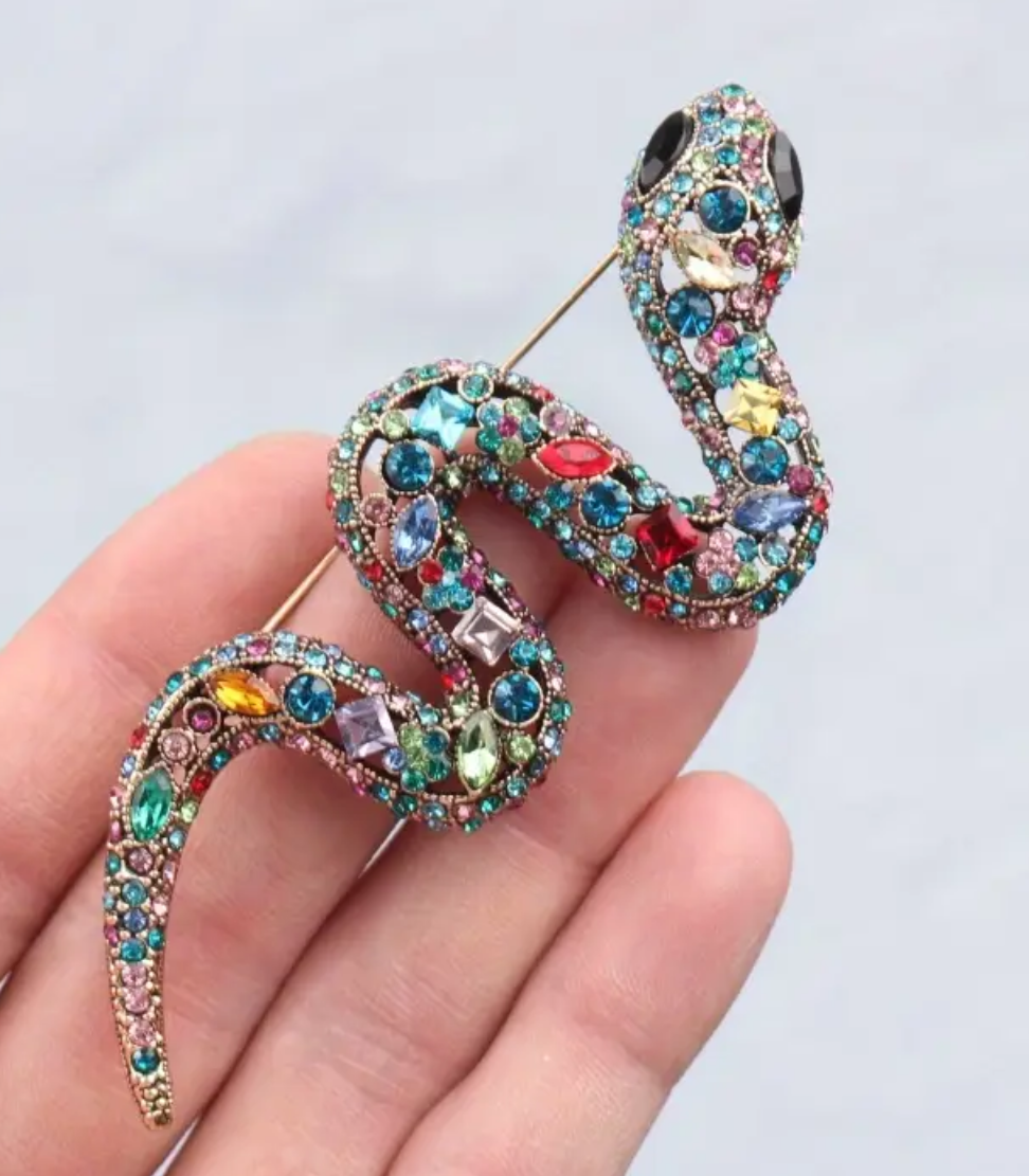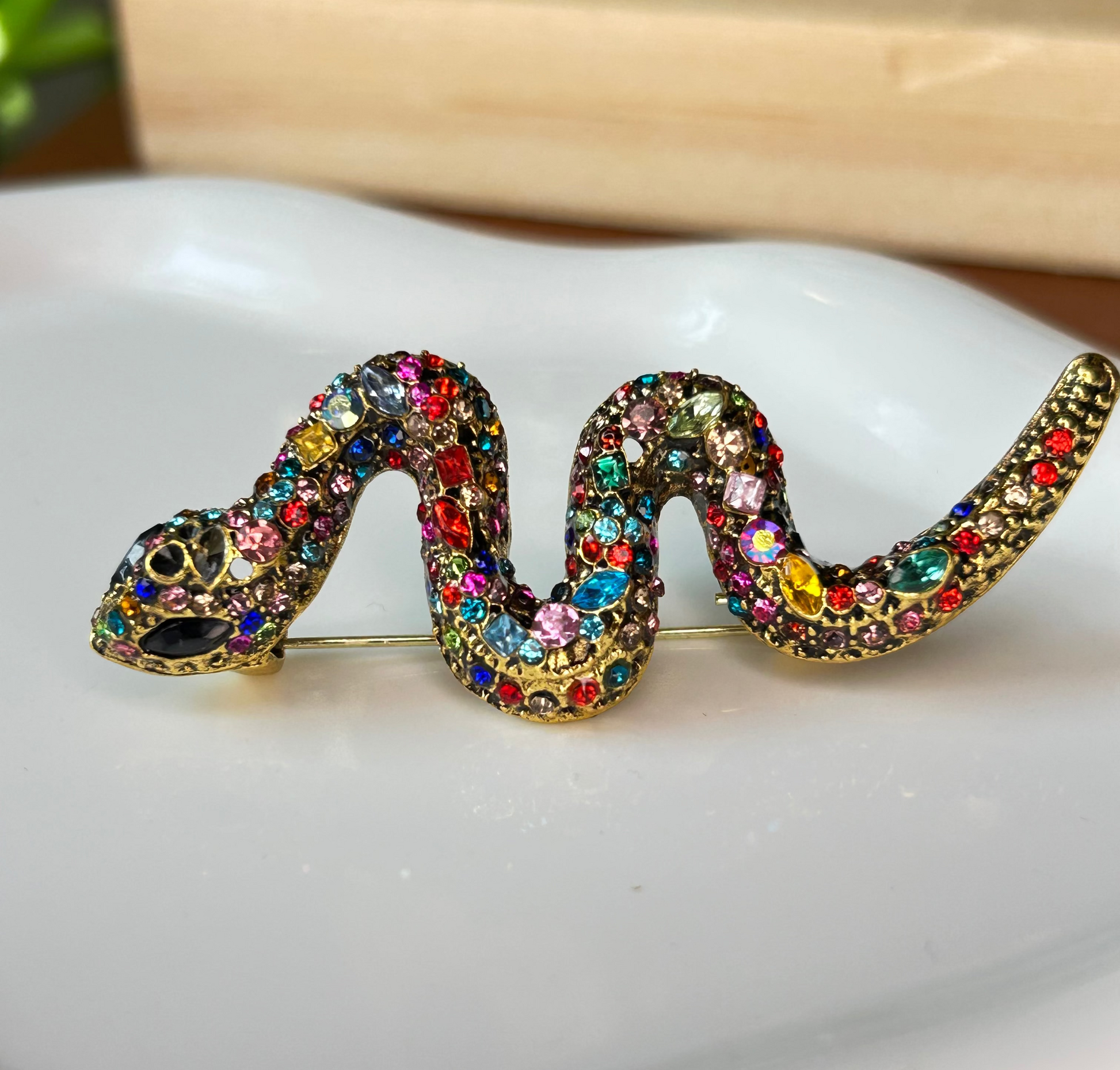 Prendedor con diseños de serpiente con strass multicolores. Tamaño G. Medidas aproximadas 6,9x2,5cm.