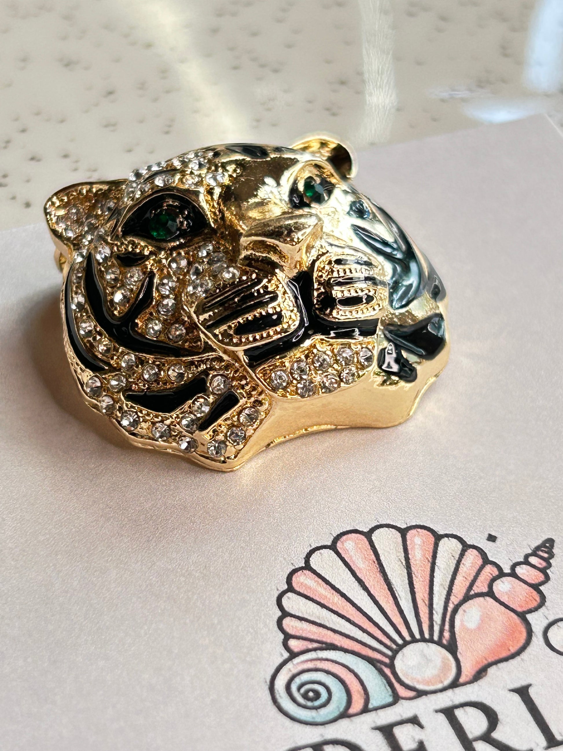 Prendedor diseño cabeza de tigre en color dorado y strass brillantes. Medida M. Tamaño aproximado 3,5x3,5cm. Modelo unisex.
