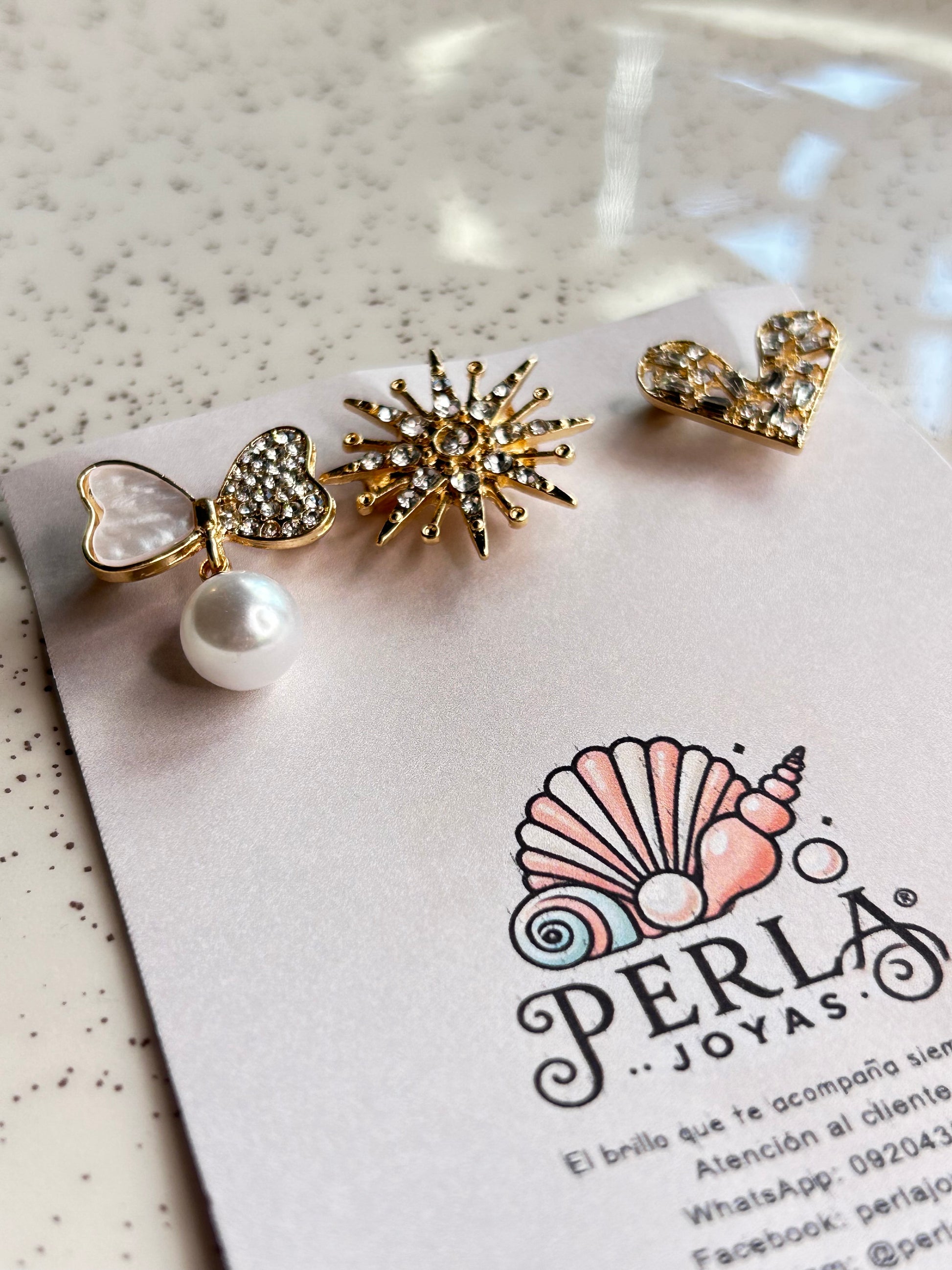 Prendedores en trío con detalles de perla, moño y corazón. Tamaño P. Medidas aproximadas 2x2cm.