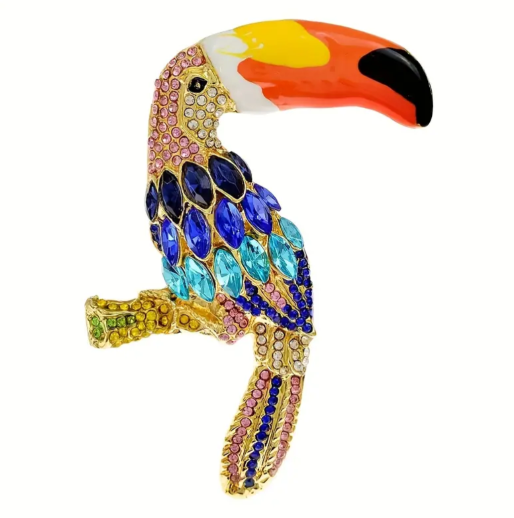 Si tendedero con diseño de tucán con strass multicolores. Hermoso y elegante. Medidas aproximadas 7,6x6cm.