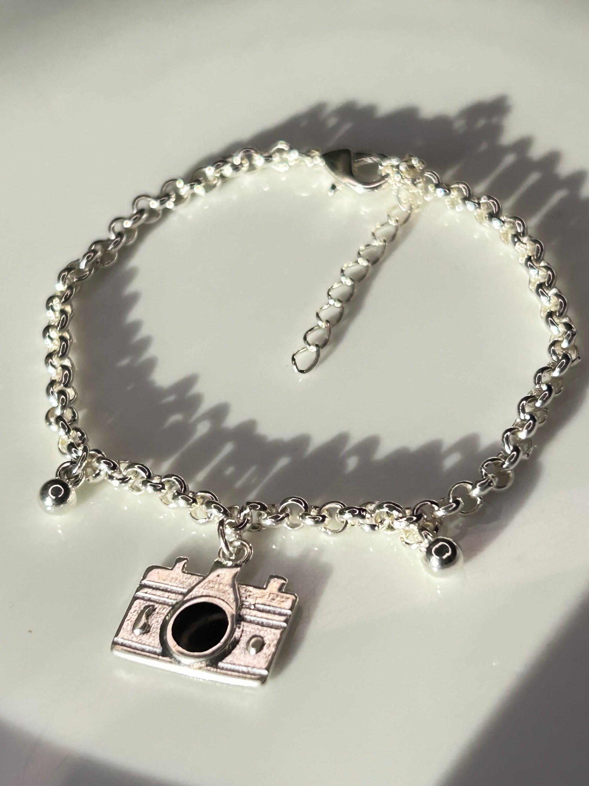 Pulsera bañada en plata con dije de cámara fotográfica y dos bolitas.
