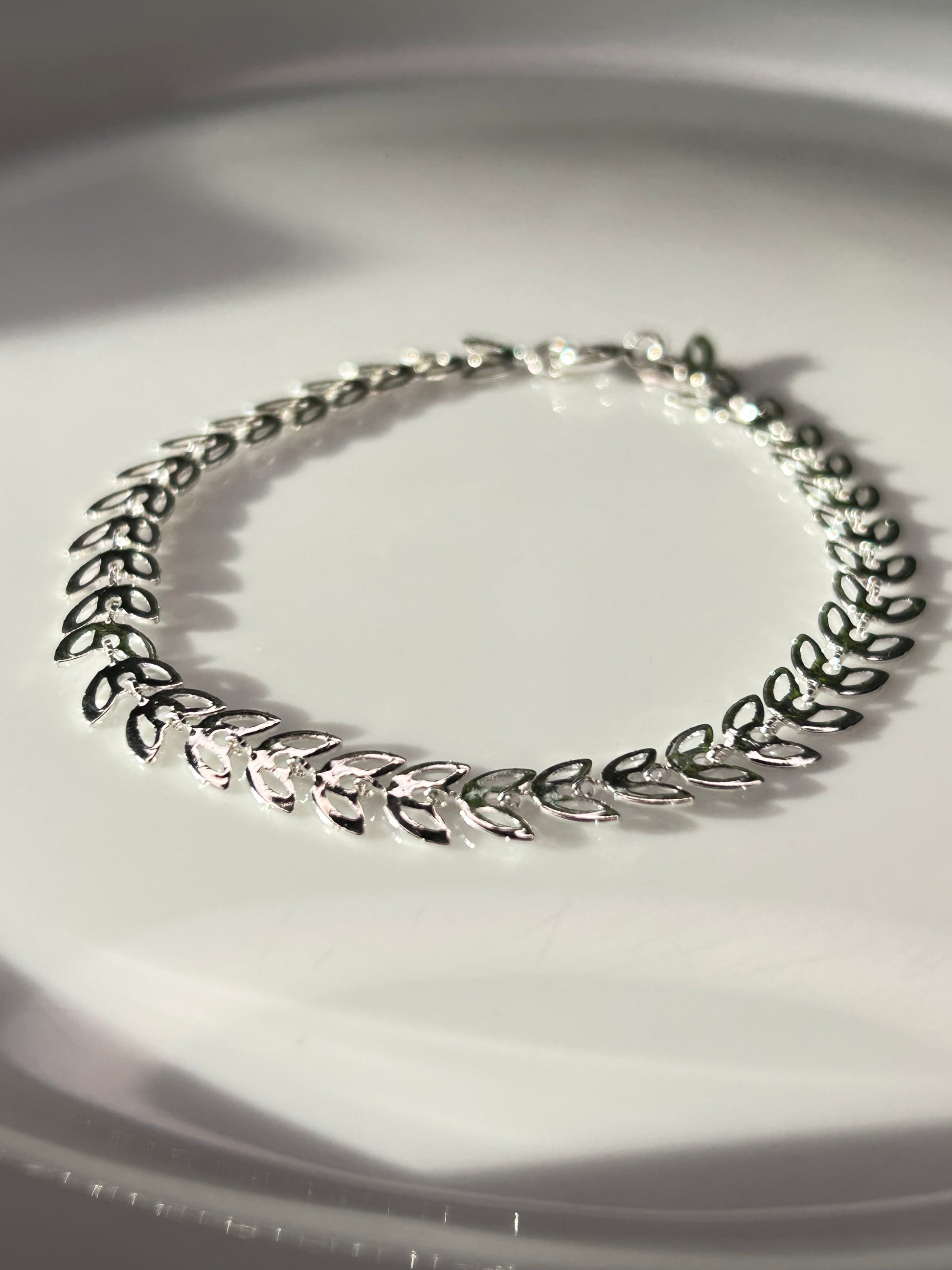 Pulsera hojitas bañada en plata. Medida 20CM.