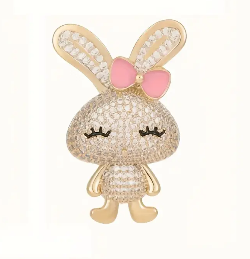 Prendedor con diseño de coneja. Strass brillantes y detalle de moño rosa. Medidas aproximadas 3,4x2,2cm.